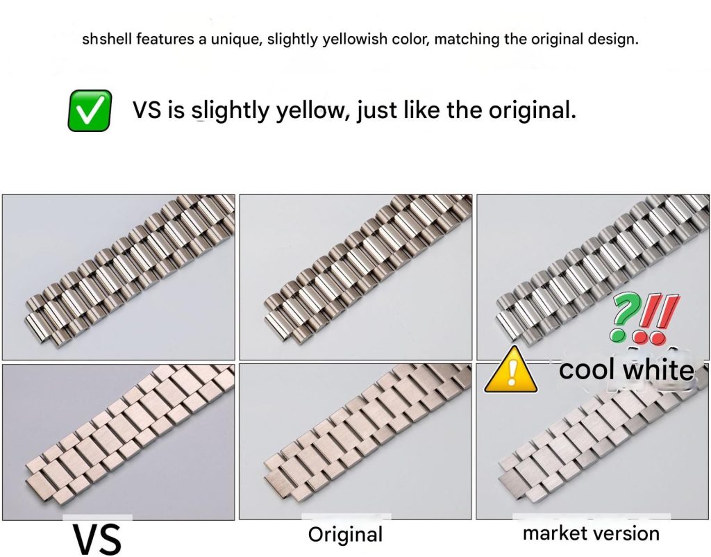 - The Market Flaw: Standard market versions use a harsh, “cold white” tone that instantly gives the watch away as a stainless-steel fake. VSF solves this completely.