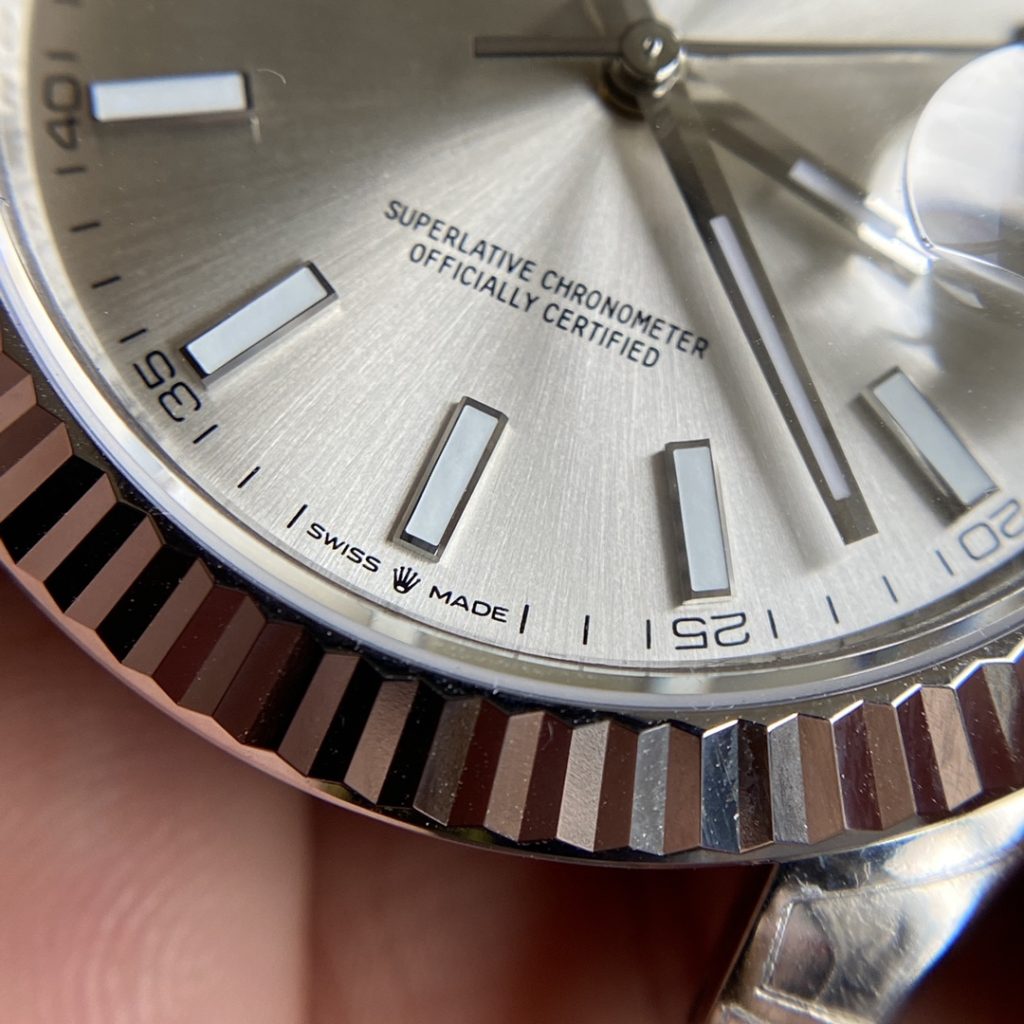 - Sunray Finish & Typography: The macro shots reveal an exceptionally fine brushing radiating from the center. This creates a metallic, shifting sunburst effect that perfectly mimics the genuine dial’s reaction to ambient light. The “ROLEX OYSTER PERPETUAL DATEJUST” text and the modern “SWISS ♛ MADE” designation at 6 o’clock exhibit clean, crisp edges without any ink bleeding, showcasing advanced pad printing techniques.