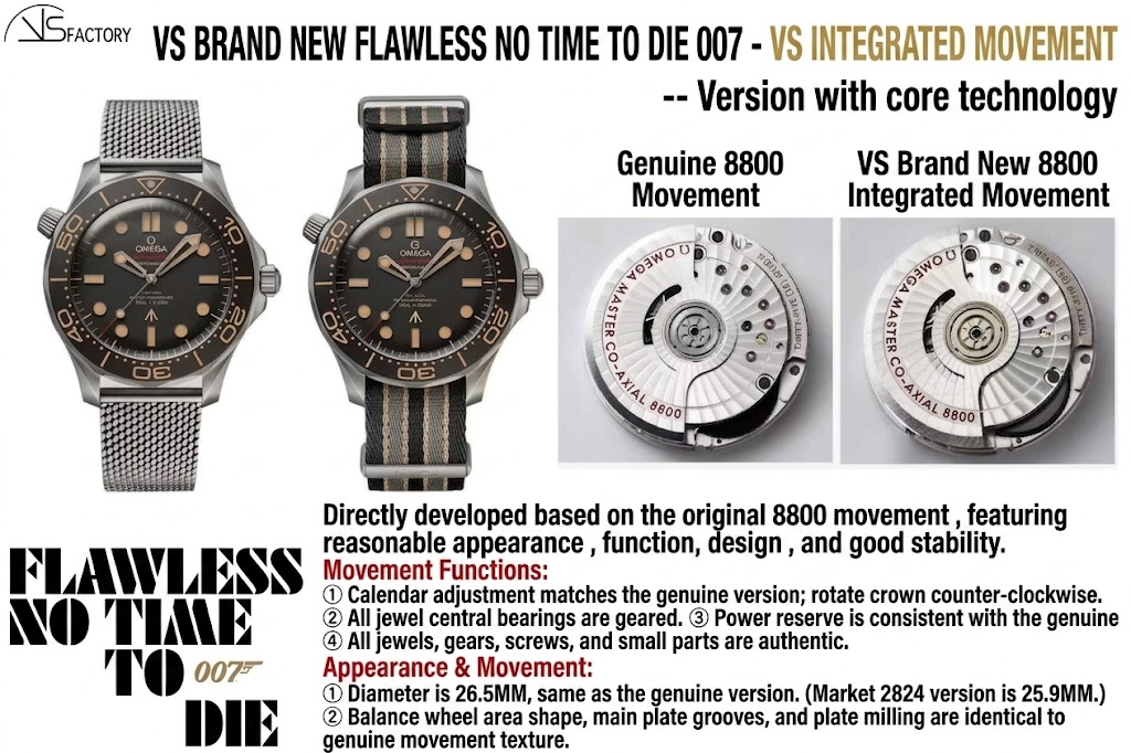 The Omega Seamaster Diver 300M 007 Edition “No Time To Die” (Reference: 210.90.42.20.01.001) presents unique manufacturing challenges due to its use of Grade 2 Titanium, a specific “tropical” brown aluminum bezel, and a highly specialized mesh bracelet. In the replica market, multiple iterations have attempted to capture these nuances. This technical evaluation provides an objective, deep-dive analysis of the latest release from VS Factory (VSF), examining the V4 titanium mesh bracelet, the V3 bezel insert, and the integrated Dandong 8806/8800 mechanical architecture.