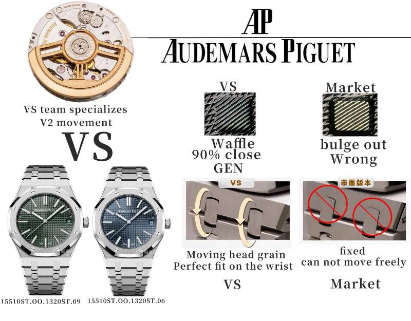 VSF AP 15510 flexible end-link articulation and 1:1 AP clasp engraving comparison