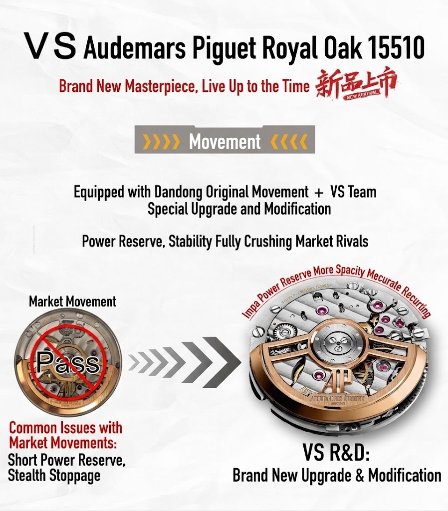 A super clone is only as good as its engine. Previous market versions of the 15510 suffered from notorious movement issues: short power reserves, random stopping (stealing time), and stuck calendar wheels. VS Factory has completely overhauled the mechanical architecture.
