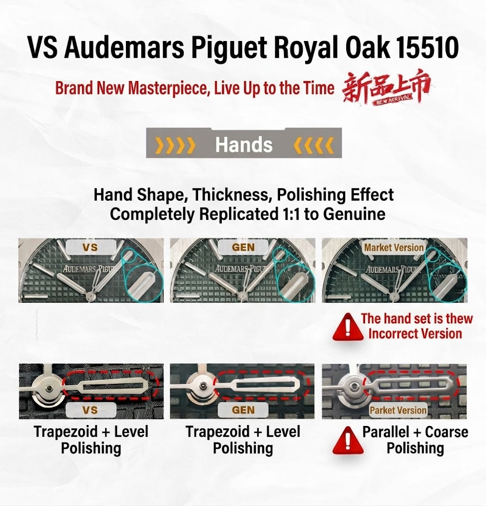 • Trapezoidal Hands Finishing: The hour and minute hands on the 15510 are broader than previous generations. VSF replicates the exact thickness and features a flawless, polished trapezoidal bevel. Competitor clones use overly thin, flat-polished hands with rough, jagged edges.