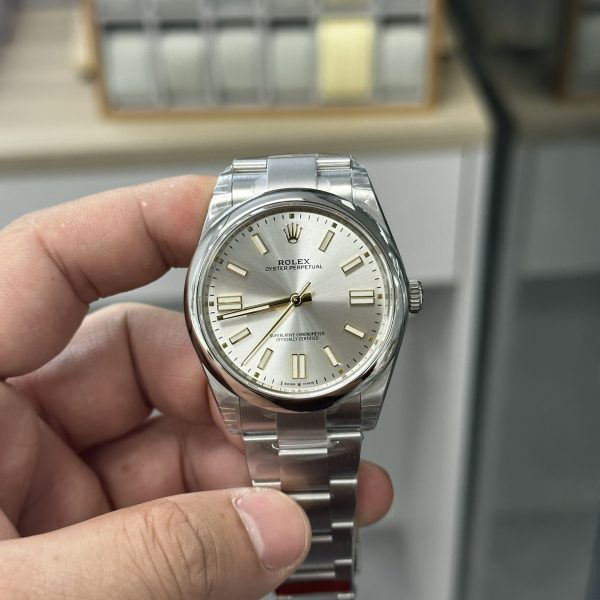 VS Factory Rolex Oyster Perpetual 41mm Silver Sunburst Dial (Gold Accents) Smooth Bezel Oyster Bracelet (124300) 1:1 Super Clone – DD3230 Movement