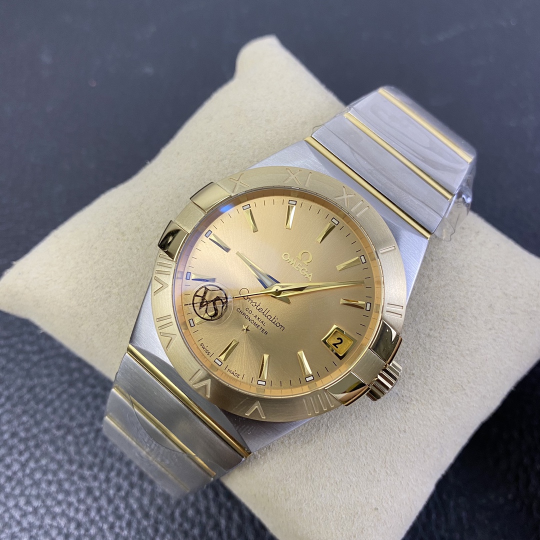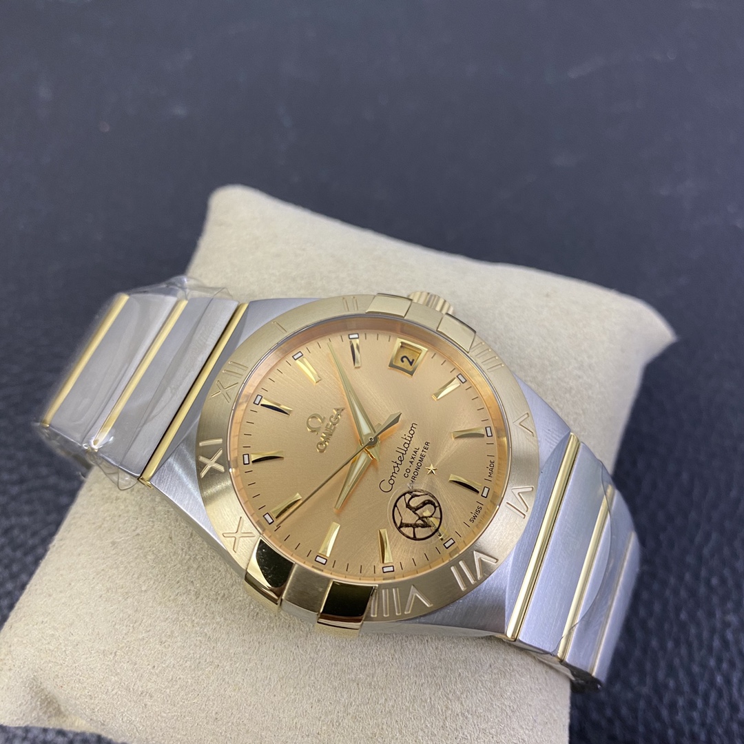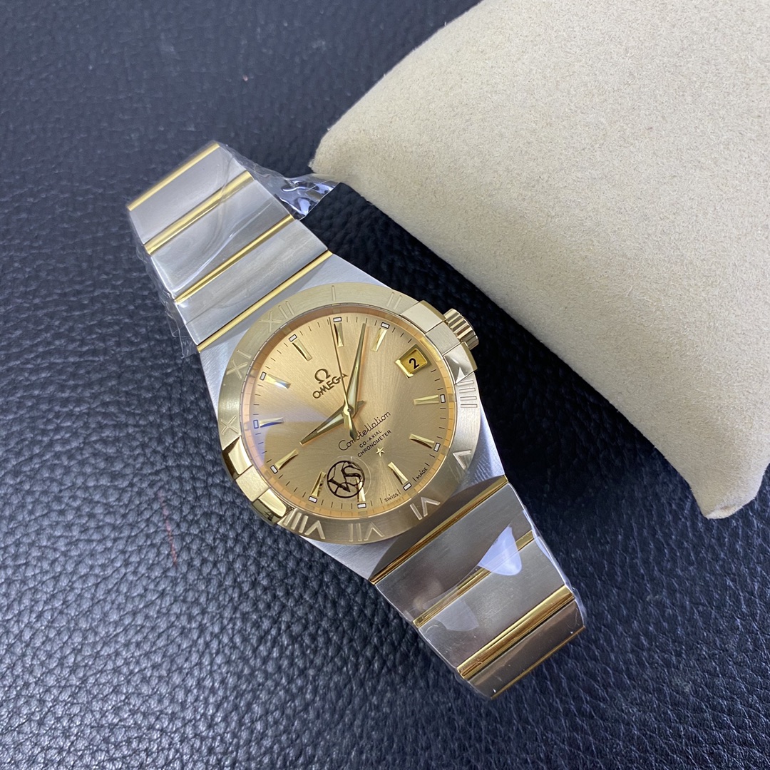 The Omega Constellation (Reference 123.20.38.21.08.001) is a timeless symbol of horological elegance, blending iconic architectural design with a deeply wealthy, classic luxury aesthetic. Flawlessly executed by the legendary VS Factory (VSF)—the undisputed masters of Omega super clones—this 1:1 replica captures the striking presence and refined proportions of the genuine article. Housed in a perfectly sized 38mm stainless steel case, it features the collection’s signature “Griffes” (claws) mounted on a brilliant 18K Yellow Gold-plated bezel. The absolute standout feature of this specific reference is its radiant, sunray-brushed champagne gold dial, which seamlessly matches the case hardware to create a cohesive, opulent look. Mounted on the legendary two-tone mono-rang integrated bracelet, this piece is the ultimate sophisticated daily wearer. Powered by the industry-leading Dandong DD8500 1:1 Co-Axial clone movement, it delivers flawless reliability, an independent jumping hour hand, and stunning decorative accuracy.