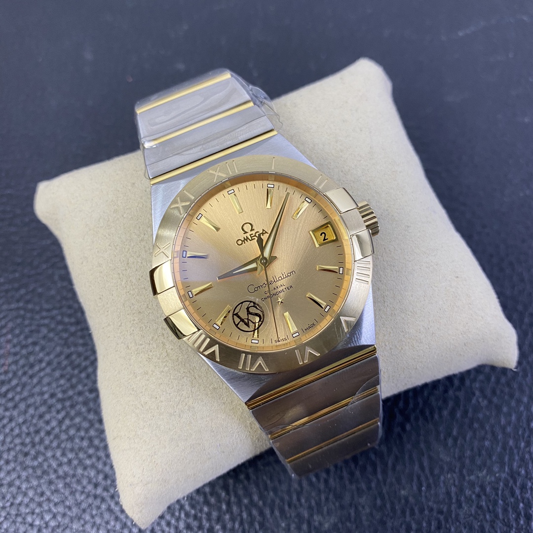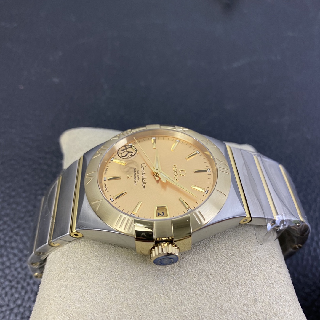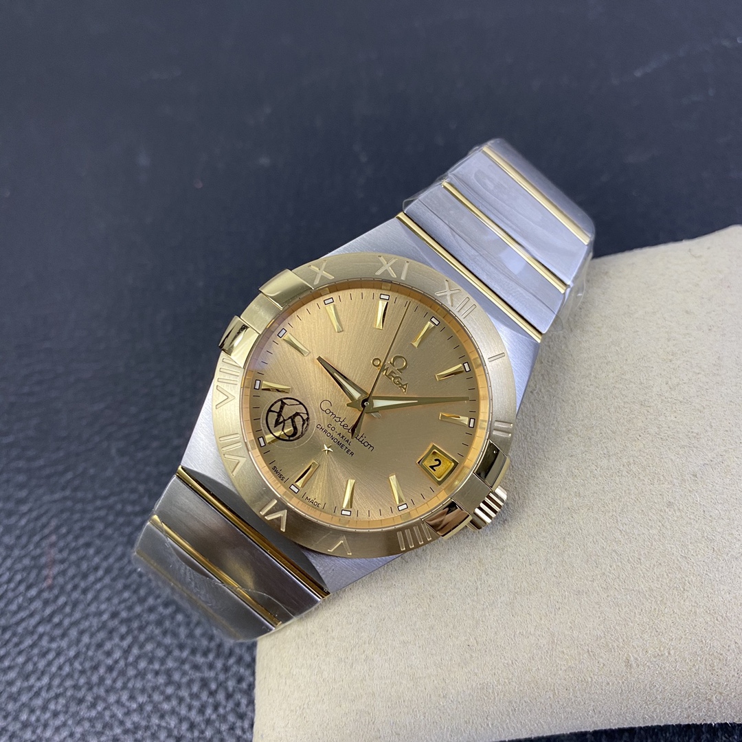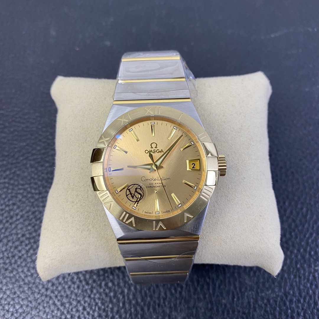 The Omega Constellation (Reference 123.20.38.21.08.001) is a timeless symbol of horological elegance, blending iconic architectural design with a deeply wealthy, classic luxury aesthetic. Flawlessly executed by the legendary VS Factory (VSF)—the undisputed masters of Omega super clones—this 1:1 replica captures the striking presence and refined proportions of the genuine article. Housed in a perfectly sized 38mm stainless steel case, it features the collection’s signature “Griffes” (claws) mounted on a brilliant 18K Yellow Gold-plated bezel. The absolute standout feature of this specific reference is its radiant, sunray-brushed champagne gold dial, which seamlessly matches the case hardware to create a cohesive, opulent look. Mounted on the legendary two-tone mono-rang integrated bracelet, this piece is the ultimate sophisticated daily wearer. Powered by the industry-leading Dandong DD8500 1:1 Co-Axial clone movement, it delivers flawless reliability, an independent jumping hour hand, and stunning decorative accuracy.