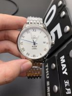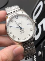 The Omega De Ville Prestige (Reference 424.10.40.20.02.002) is the epitome of classic, understated Swiss watchmaking. Stripping away the heavy bezels and maritime features of the Seamaster line, this piece represents pure boardroom elegance. Flawlessly executed by the legendary VS Factory (VSF)—the undisputed masters of Omega super clones—this 1:1 replica captures the ultra-refined aesthetic and slim architectural design of the genuine article. Housed in a perfectly proportioned 39.5mm stainless steel case, it features a pristine silvery-white opaline dial adorned with traditional Roman numerals. The absolute standout feature is the elegant use of color: rich, rose gold-plated hour markers perfectly contrasted by a solitary, thermally blued sweeping seconds hand. Mounted on the intricate, highly polished 7-link Prestige bracelet, this piece is the ultimate tailored suit companion. Powered by the incredibly reliable Dandong 2500 1:1 Co-Axial clone movement, it delivers flawless daily performance, a slim profile, and stunning decorative accuracy.