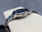 Refined Dark Blue Dial: The dial is a masterclass in elegant simplicity. Featuring a domed, dark blue finish with a subtle sun-brushed texture, it catches and shifts beautifully under the light. It is adorned with polished, rhodium-plated alternating Roman numerals and cabochon (dot) indexes, paired with elegant leaf-shaped (feuille) hands. The modern third-generation design is perfected by a clean, circular date window situated symmetrically at 6 o’clock.