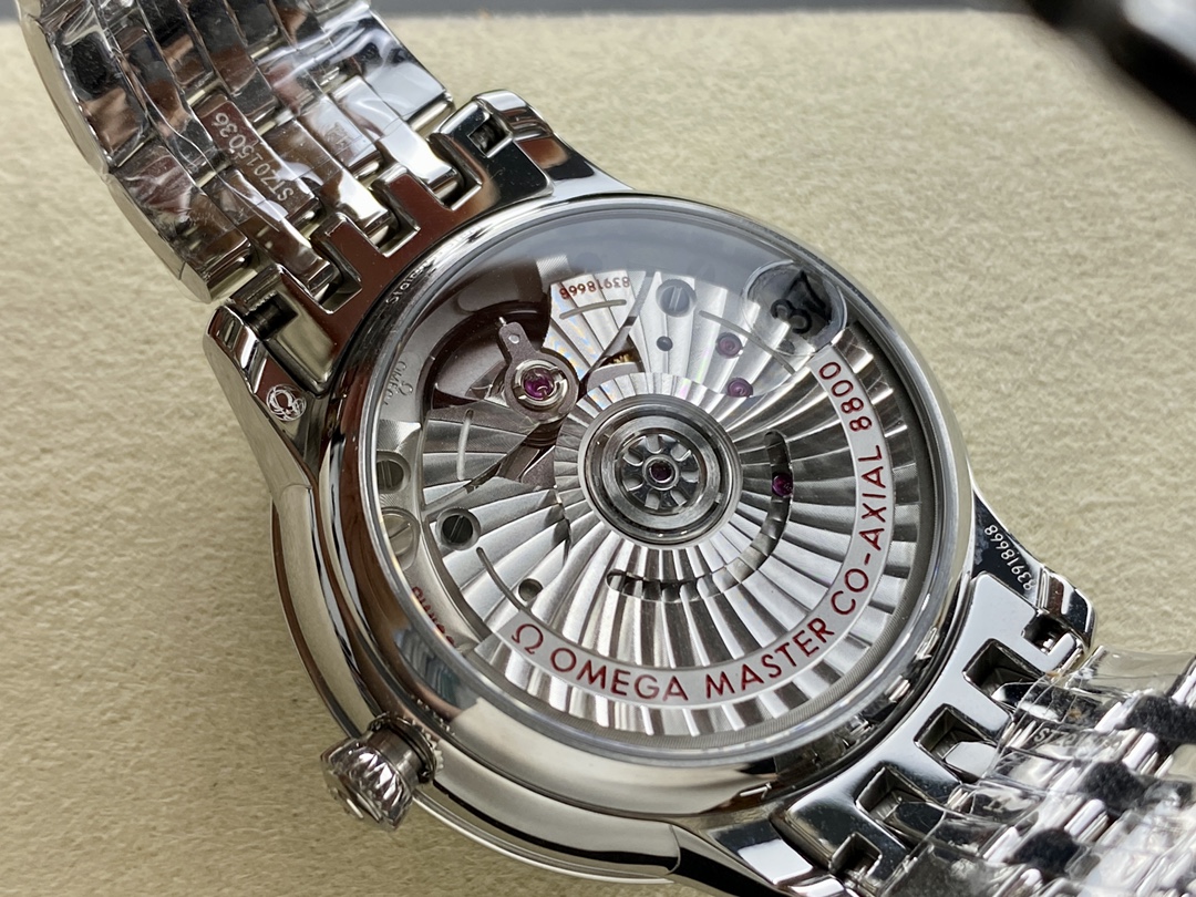 The Masterpiece DD8800 Co-Axial Movement: Beating inside is the spectacular Dandong DD8800 super clone. Universally praised as one of the most accurate and reliable clone movements ever produced, it perfectly replicates the genuine Omega Co-Axial architecture. Visible through the sapphire crystal exhibition caseback, it is decorated flawlessly with the signature blackened screws, specialized barrel, and distinct Geneva waves in arabesque.