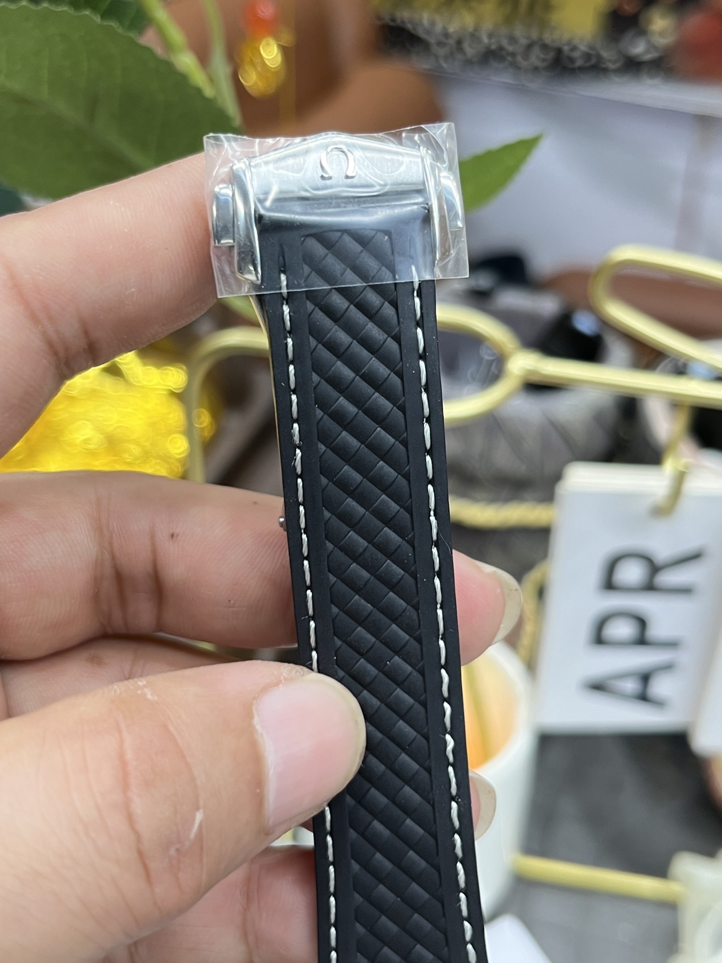 Strap: Black Structured Rubber Strap with White Contrasting Stitching, Stainless Steel End-Links, and Fold-Over Deployant Clasp