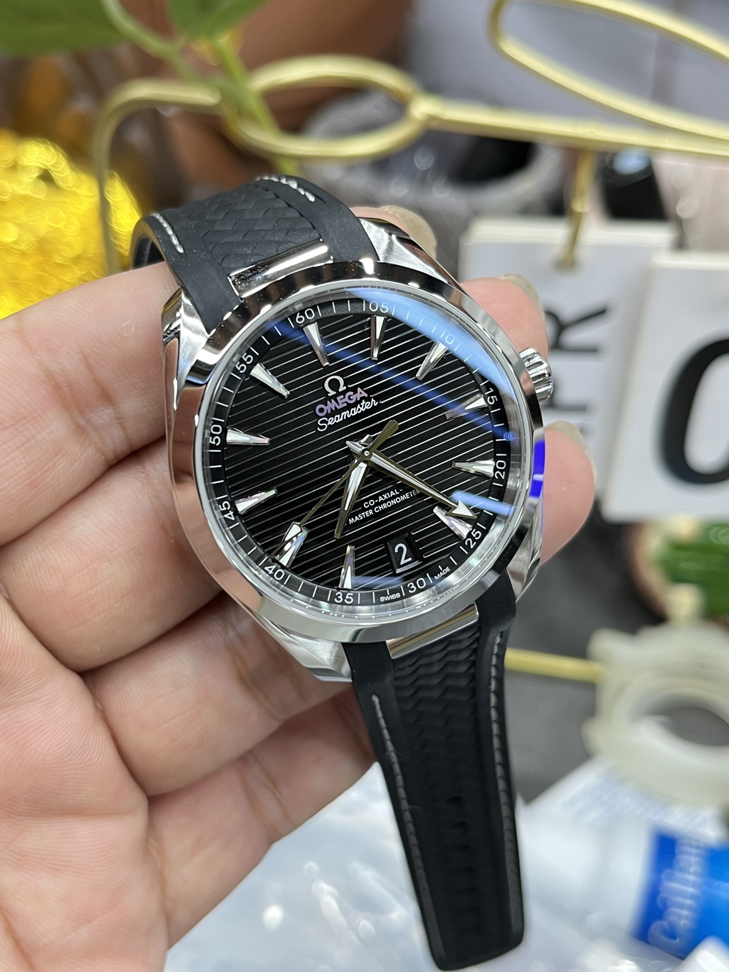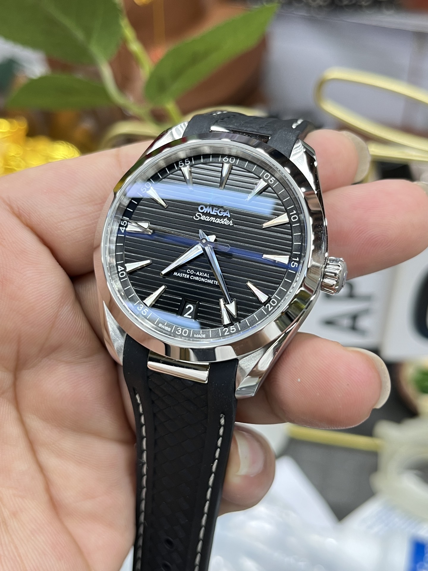 Deep Black “Teak” Dial: Providing the perfect high-contrast canvas, the dial features Omega’s modern horizontal “teak” pattern, finished in a brilliant sunray-brushed deep black. To ensure maximum legibility against the dark dial, the faceted, skeletonized broad-arrow hands (hour and minute) and the wedge-shaped hour markers are rhodium-plated and generously filled with white Super-LumiNova.