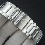 • Upsized 43mm Case Profile: To perfectly accommodate the highly legible GMT dial, this specific model features a bolder 43mm stainless steel case. It retains Omega’s signature twisted “lyre” lugs, beautifully alternating between fine satin-brushed sides and highly polished sweeping bevels, framed by a gleaming, smooth polished steel bezel.