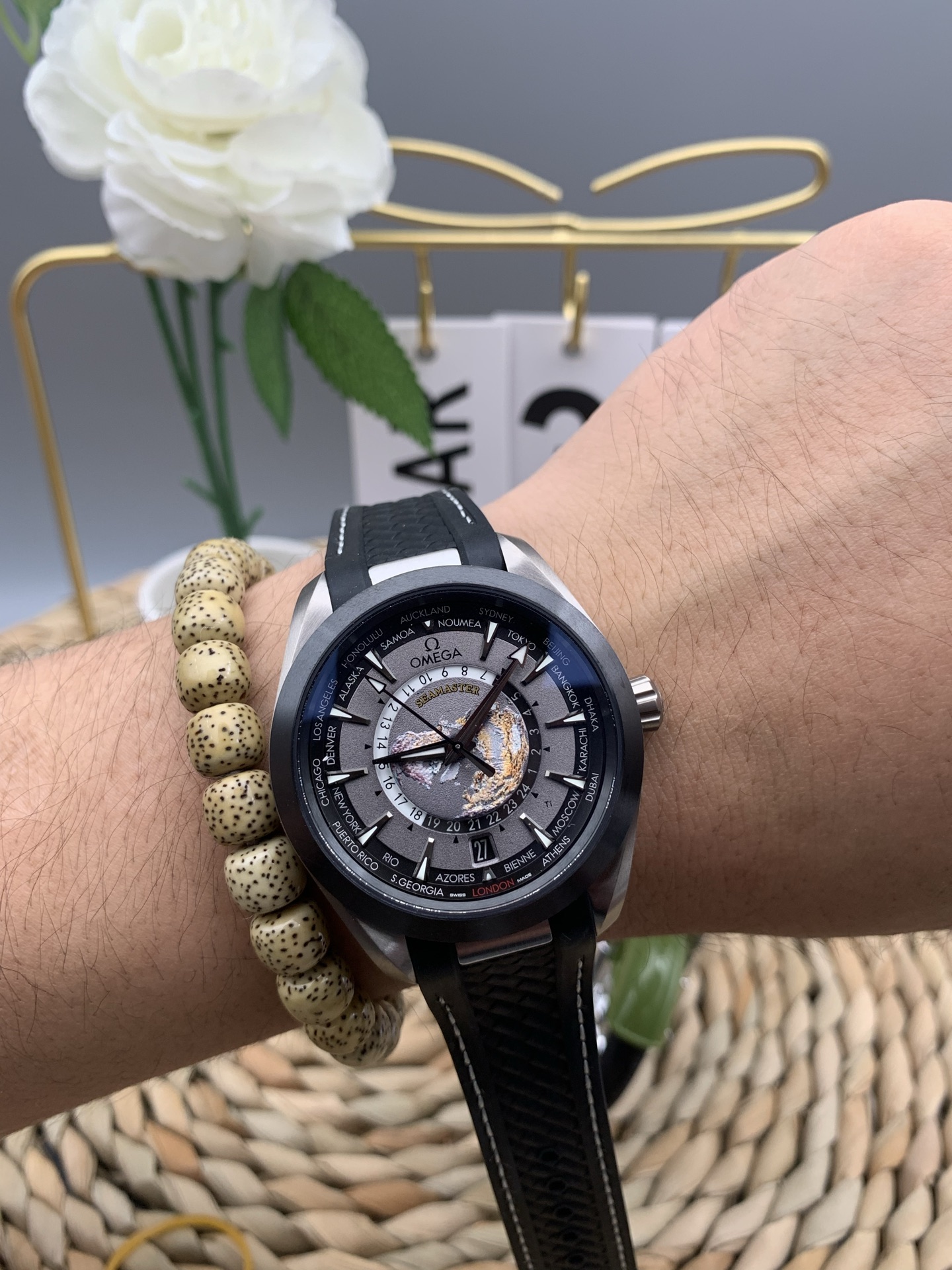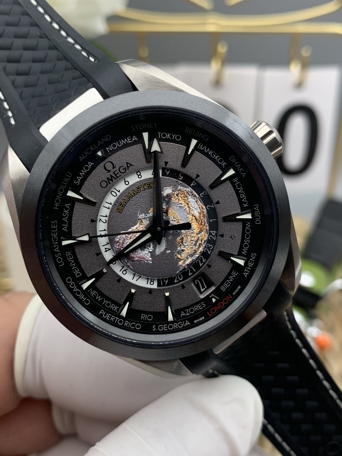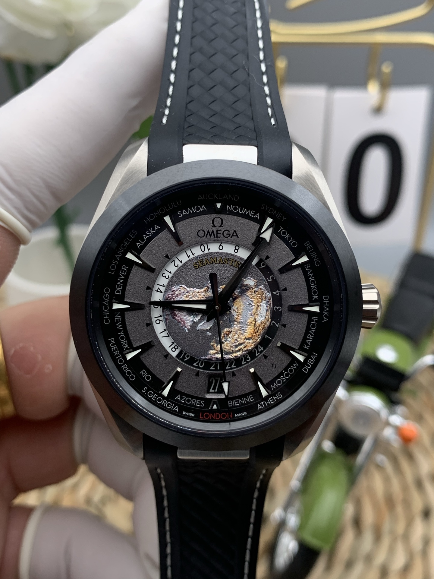 3D Laser-Ablated Earth Map: The undisputed star of the Worldtimer is the center medallion. VSF has flawlessly replicated Omega’s technique of using a Grade 5 Titanium plate that is laser-ablated to create a true three-dimensional relief map of the Earth’s continents and oceans. The colors and textures are achieved naturally through the laser’s heat, providing an incredibly detailed view of the globe looking down from the North Pole.