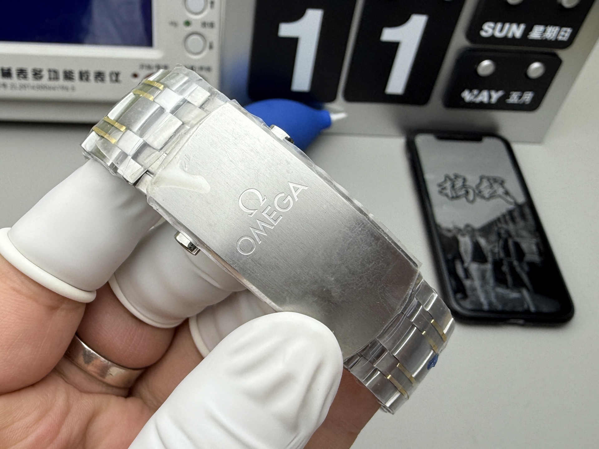 • Two-Tone 5-Link Bracelet: Elevating this piece into the highest tier of luxury sports watches, it is mounted on the Seamaster’s iconic 5-link bracelet. VSF has beautifully integrated the 18K Yellow Gold plating on the two mid-links, draping like fine jewelry across the wrist. It is secured by a robust fold-over deployant clasp equipped with an extendable micro-adjustment mechanism.