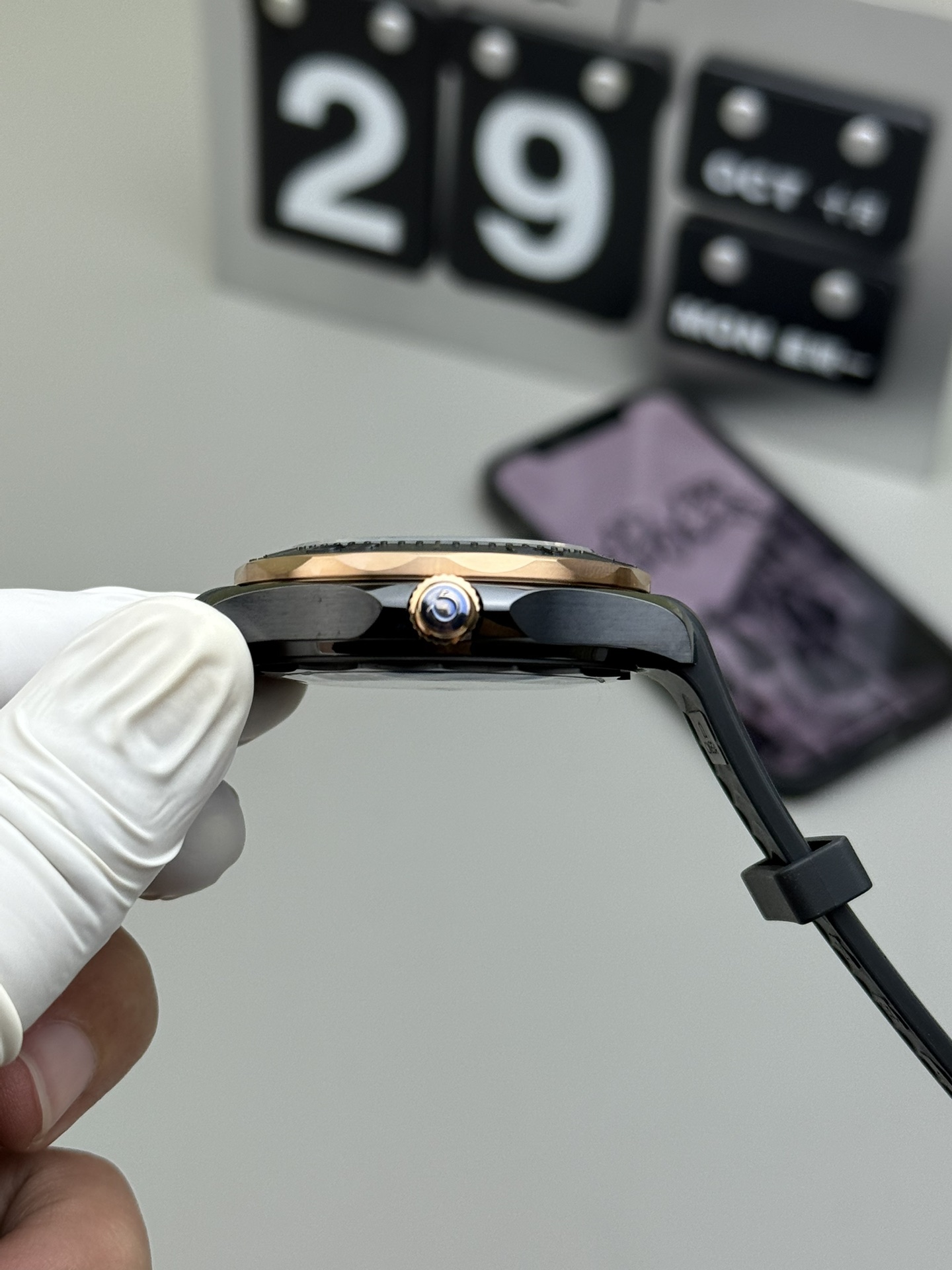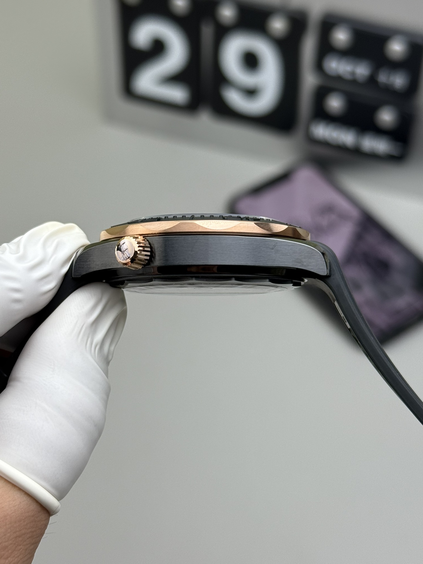 • Luxurious Sedna Gold Hardware: To break up the stealthy black profile and elevate the luxury factor, VSF has masterfully electroplated a rich, warm 18K Sedna (Rose) Gold tone onto the scalloped unidirectional bezel ring, the winding crown at 3 o’clock, and the conical Helium Escape Valve at 10 o’clock.