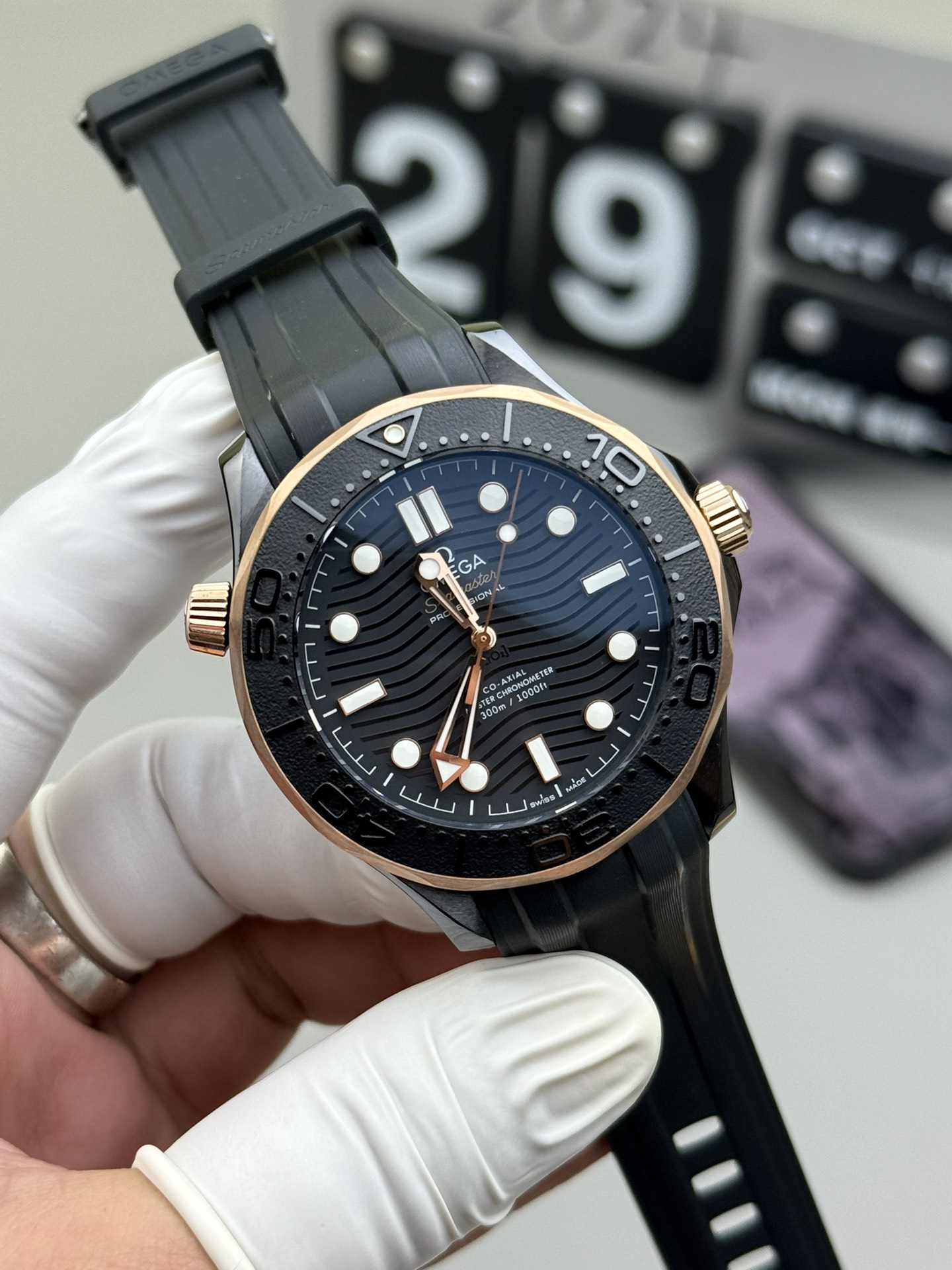 The Omega Seamaster Diver 300M in Black Ceramic and Sedna Gold (Reference 210.62.44.20.01.001) is a breathtaking marvel of modern material engineering, flawlessly blending the stealthy aggression of a tactical diver with the opulent warmth of precious metals. Flawlessly executed by the legendary VS Factory (VSF)—the undisputed masters of Omega ceramic and gold super clones—this 1:1 replica captures the massive wrist presence and intricate architectural design of the genuine article. Housed in an upsized 43.5mm case crafted entirely from a single block of black ceramic, it features striking 18K Sedna Gold accents on the bezel ring, crown, and Helium Escape Valve. The dial and bezel insert utilize complex laser-ablation to create unique “positive relief” textures, completely omitting the date window for perfect tactical symmetry. Mounted on a premium black rubber strap, this piece is an uncompromising luxury statement. Powered by the industry-leading Dandong DD8806 1:1 Co-Axial no-date clone movement, it delivers flawless reliability and stunning decorative accuracy.