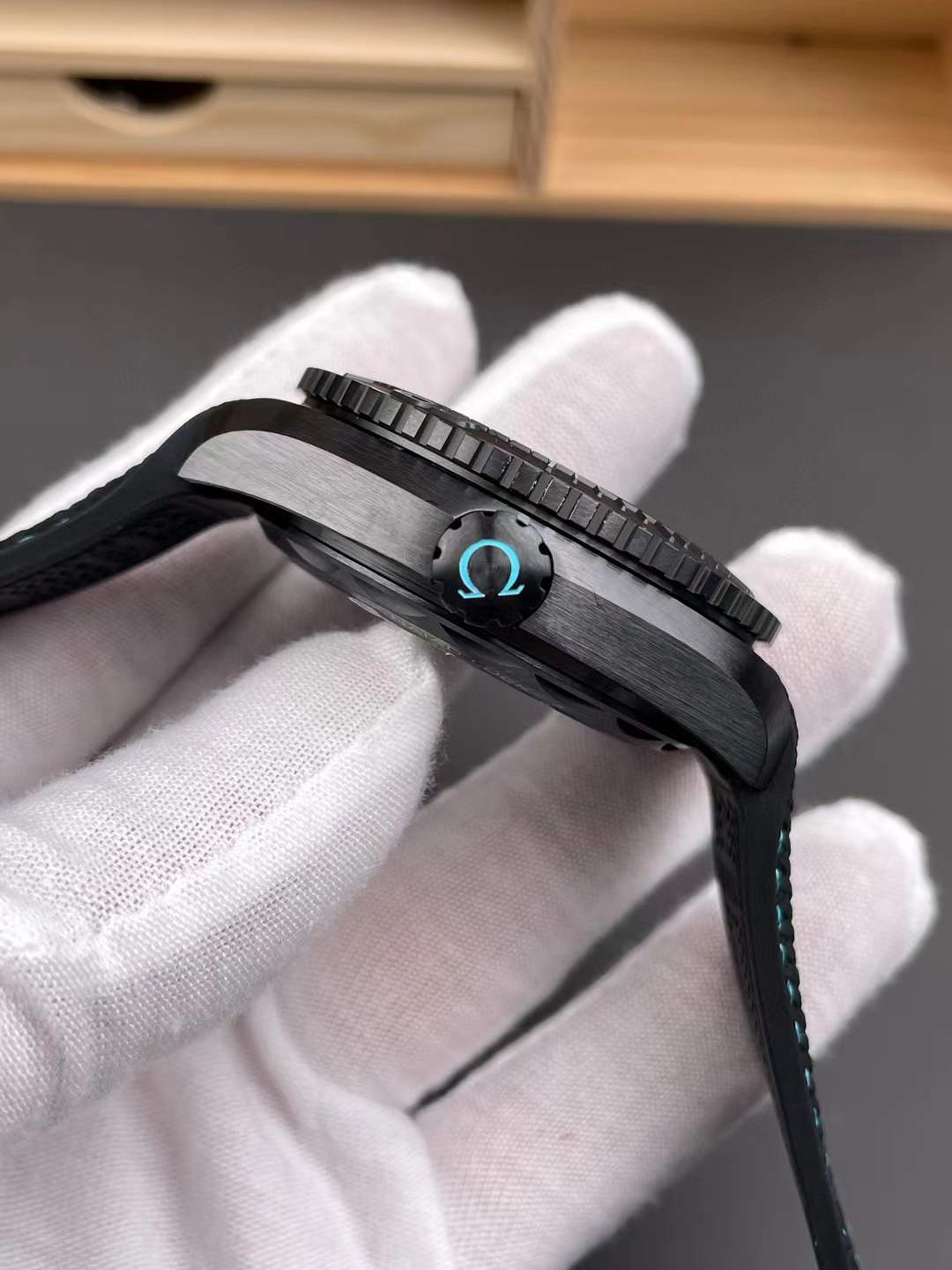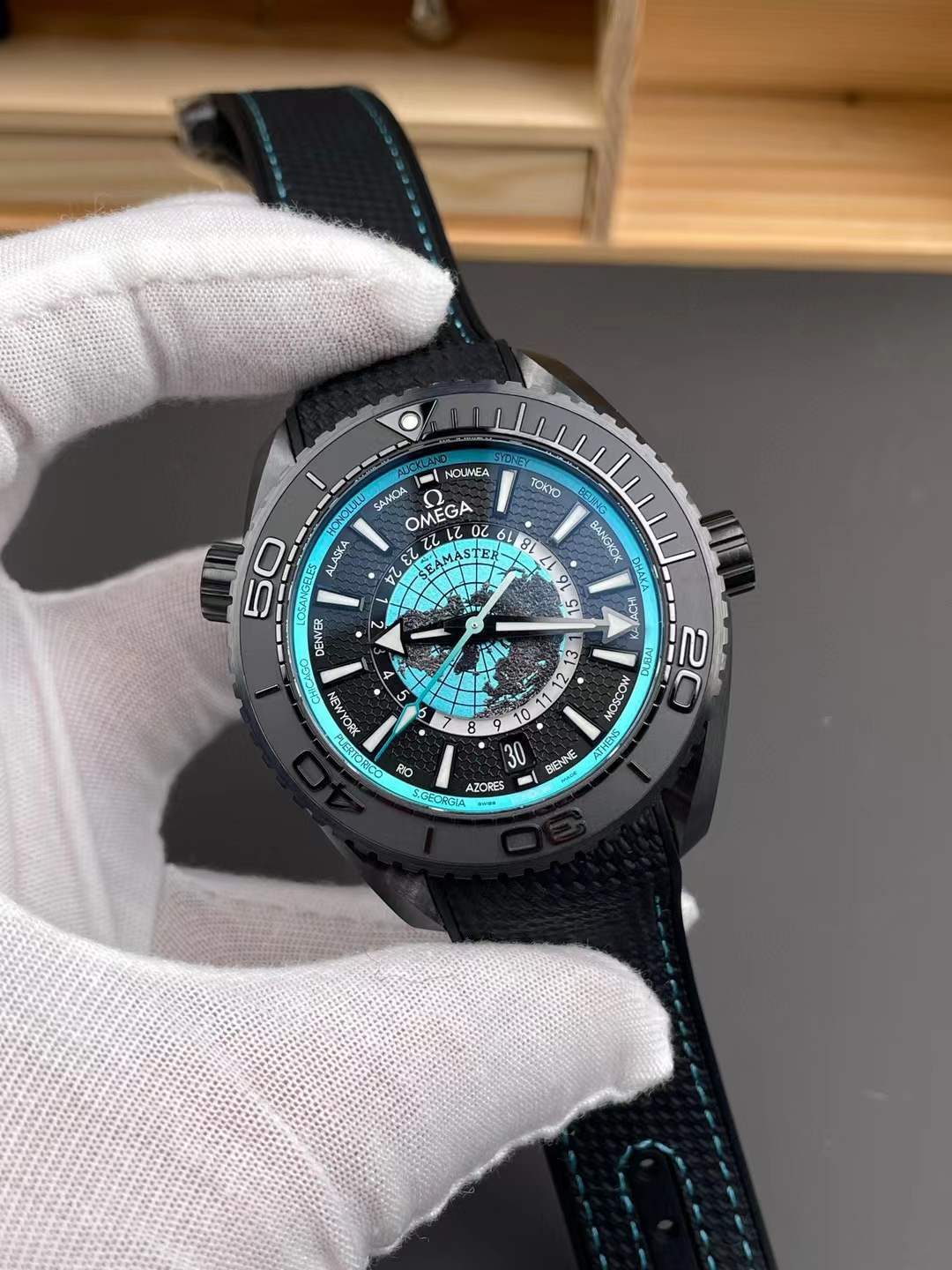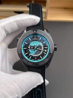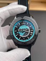 The Omega Seamaster Planet Ocean Worldtimer (Ref. 215.92.46.22.01.006) is an absolute masterclass in extreme tactical engineering, merging a highly complex global GMT complication with a heavy-duty deep-sea dive watch. As the undisputed sovereign commanders of Omega super clones, VS Factory (VSF) has executed this massive, modern silhouette with terrifying precision. Housed in a colossal 45.5mm case forged entirely from brushed high-tech black ceramic [ZrO2], it is virtually scratch-proof and incredibly stealthy. The absolute standout feature is the multi-layered tactical dial: a laser-ablated 3D titanium globe viewed from the North Pole, surrounded by a black DLC honeycomb hour track and a high-visibility turquoise global city ring. Mounted on a heavy-duty integrated black rubber strap with vibrant turquoise contrast stitching, this piece is the ultimate intercontinental deep-sea dominator. Powered by the unrivaled Custom VSF Caliber 8938 automatic movement, it delivers true world-time functionality, an independent jumping local hour hand, and flawless mechanical execution.