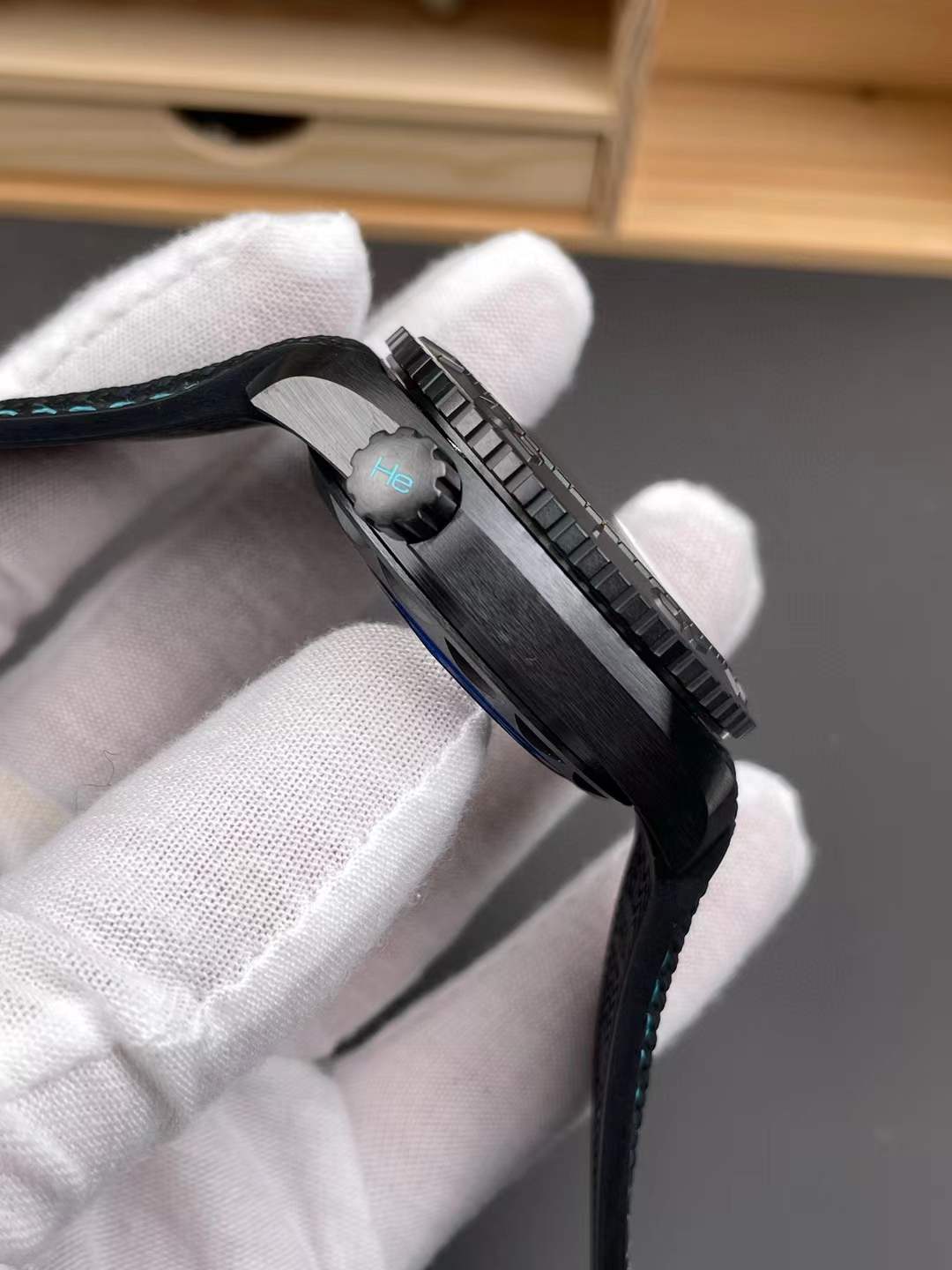 Strap: Premium Heavy-Duty Black Structured Rubber Strap with Turquoise Contrast Stitching, equipped with a Black Ceramic and Ceramized Titanium Foldover Deployant Clasp
