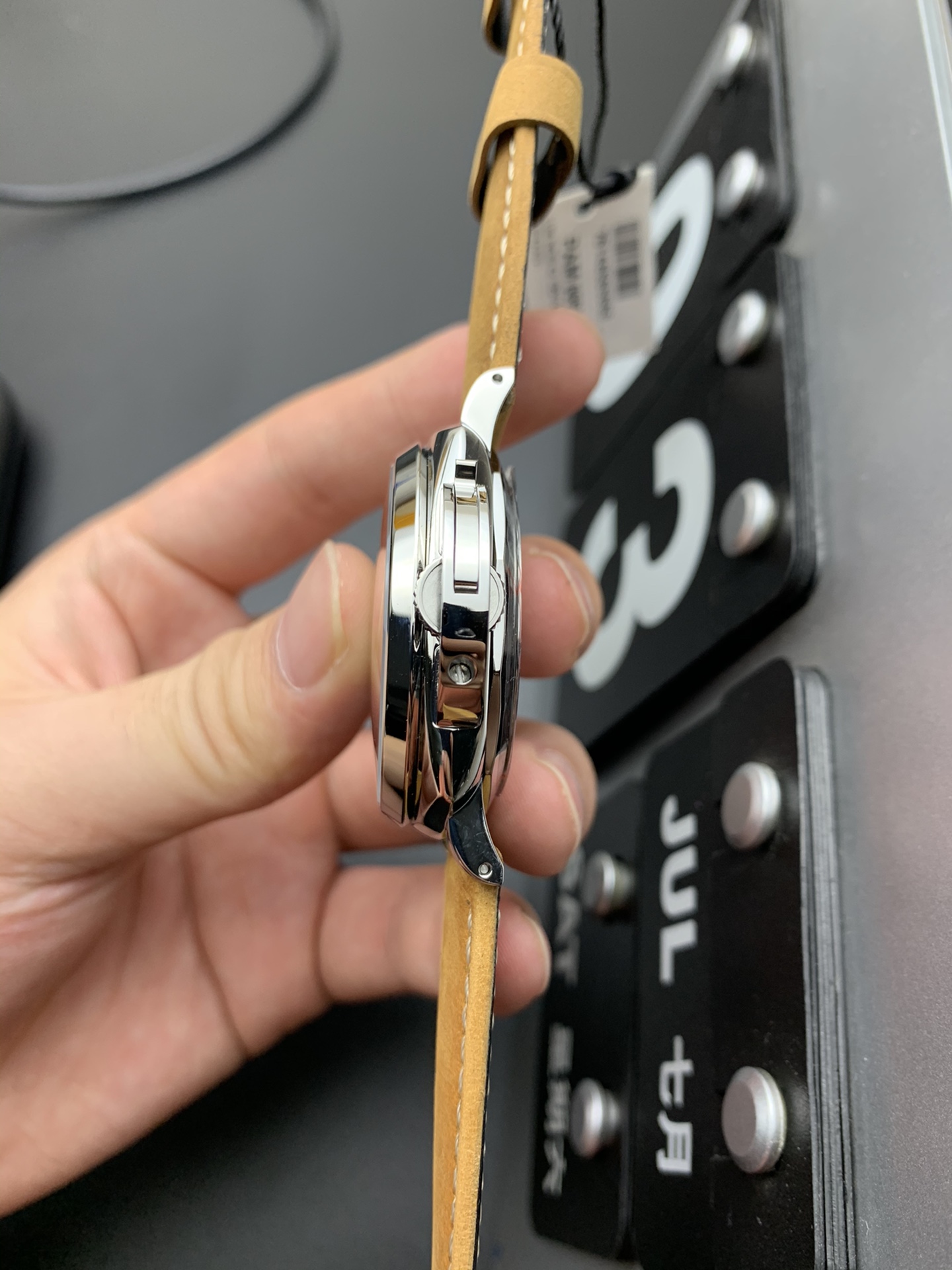 Strap: Premium Light Brown/Tan “Scamosciato” (Suede/Nubuck) Leather Strap (affectionately known by Paneristi as the Assolutamente strap) with Beige Contrast Stitching and a Polished Steel Pre-V Tang Buckle