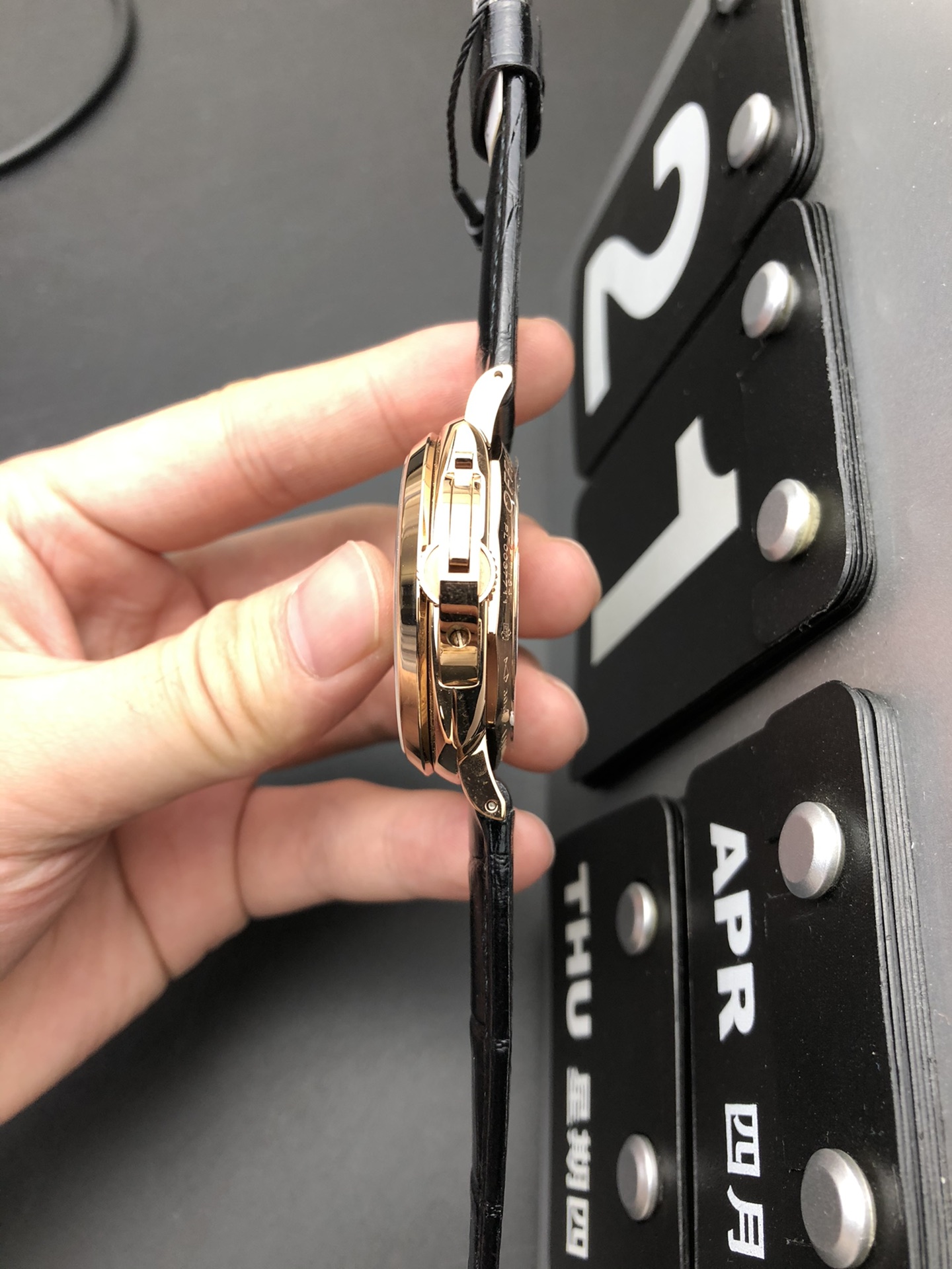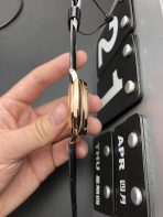 Strap: Premium Black Alligator-Embossed Leather Strap with Tone-on-Tone Stitching and Rose Gold Plated Pre-V Tang Buckle