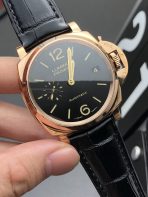 The Panerai Luminor Due (PAM01041) represents a radical, highly successful departure for the brand, taking the massive, historically bulky Luminor silhouette and completely re-engineering it into a slim, sophisticated dress watch. Flawlessly executed by the master watchmakers at VS Factory (VSF)—the absolute, undisputed kings of Panerai super clones—this 1:1 replica captures the elegant geometry and extreme luxury of the genuine article. Housed in the versatile 42mm case, it is heavily plated in Panerai’s signature “Goldtech” (a unique rose gold alloy mixed with copper and platinum for a richer, redder hue). The absolute standout feature is the deep, sun-brushed black sandwich dial, perfectly complemented by the polished golden hands and vintage-toned luminous markers. Mounted on a premium black alligator leather strap, this piece is the ultimate formal Panerai, designed to slide effortlessly under a tailored shirt cuff. Powered by the advanced Custom Dandong P.900 automatic clone movement, it delivers unparalleled reliability, a remarkably thin profile, and flawless mechanical execution.
