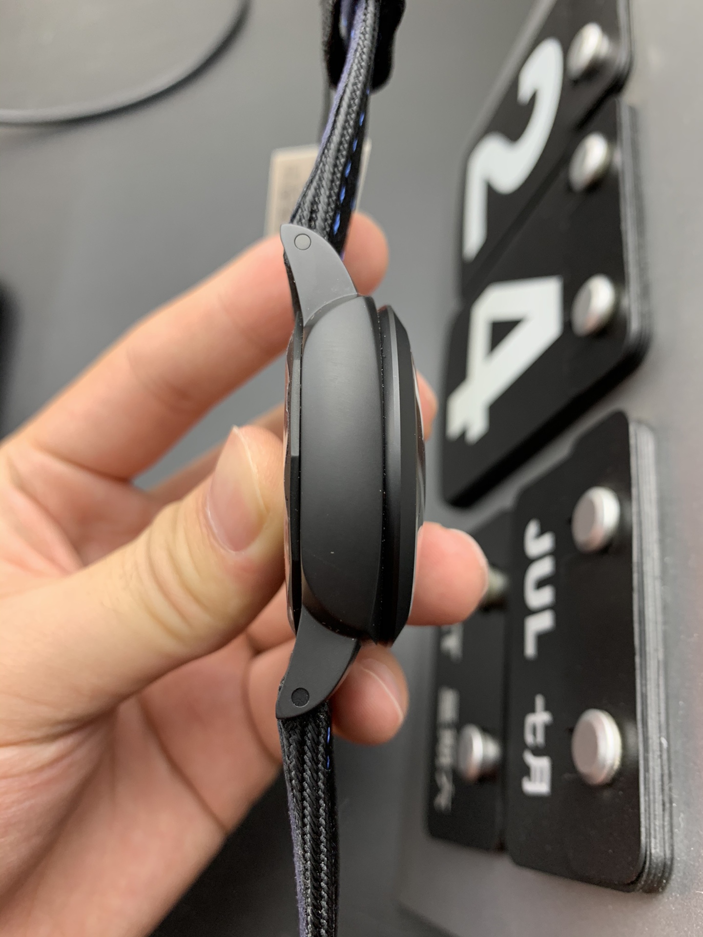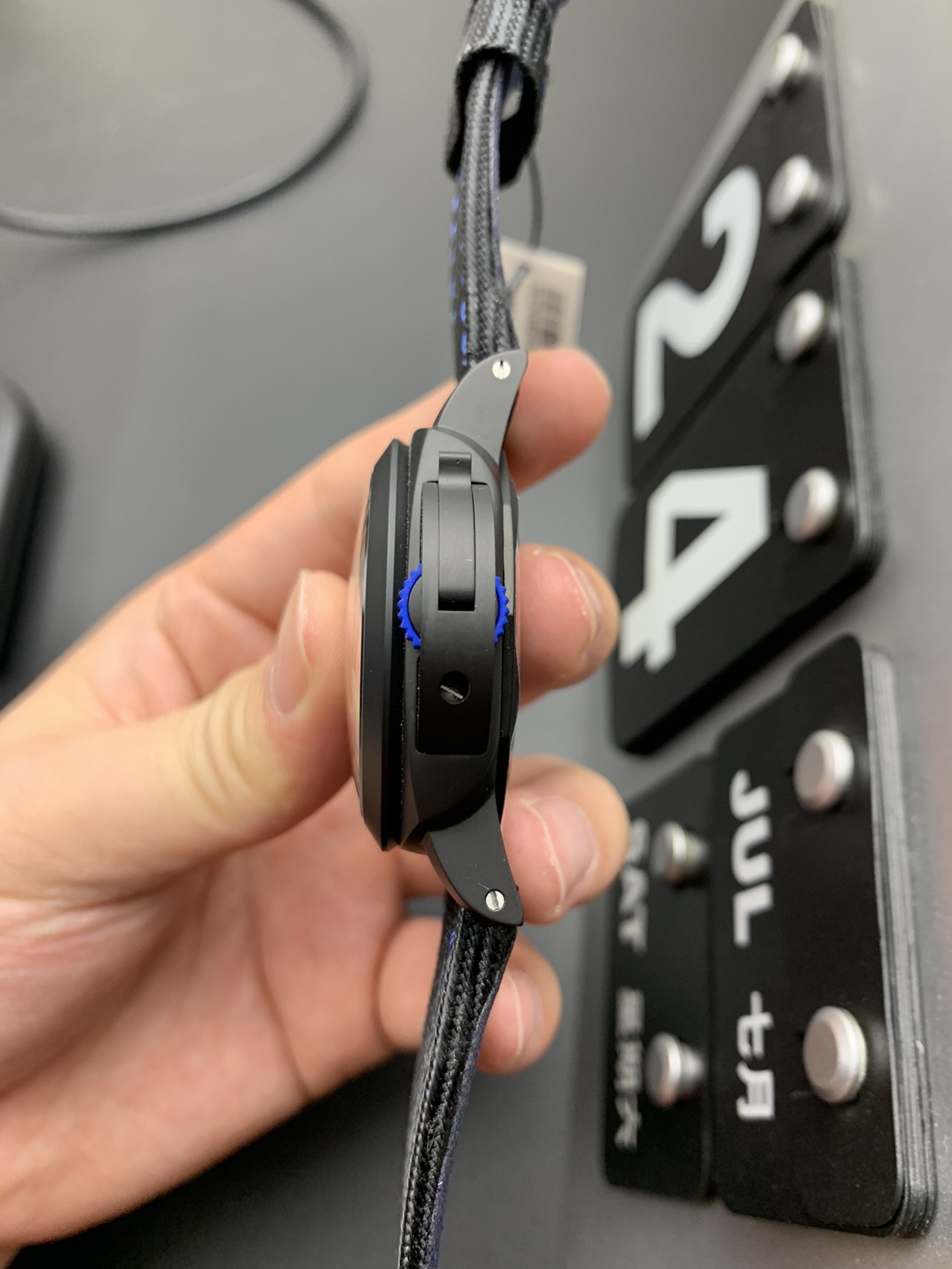 Strap: Premium Black Sportech (Rubberized Woven Fabric) Strap with Electric Blue Contrast Stitching and Black DLC-Coated Titanium Pre-V Tang Buckle