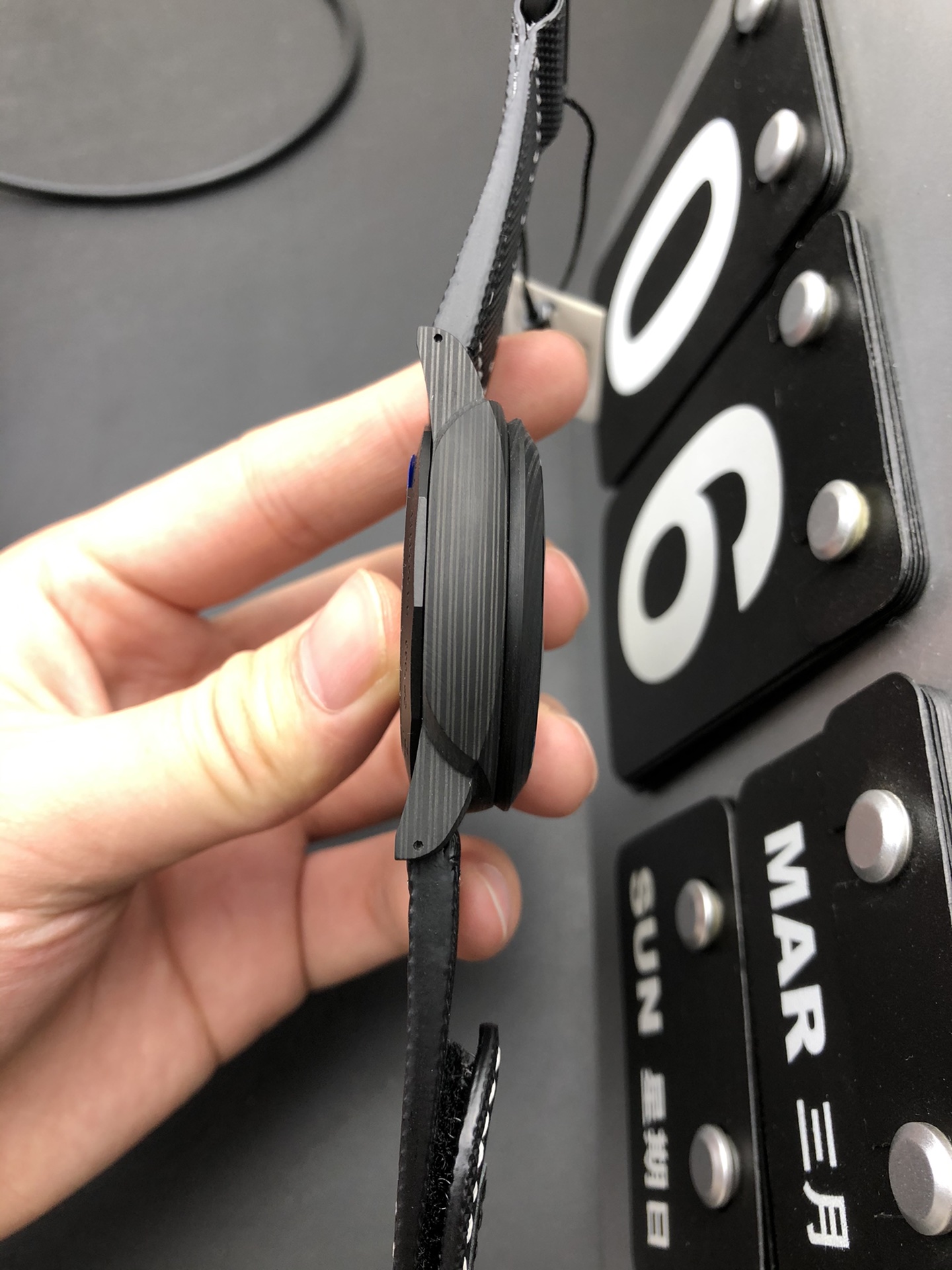 Material: Custom VSF Carbotech (Ultra-Lightweight Carbon Fiber Composite with unique wavy grain)