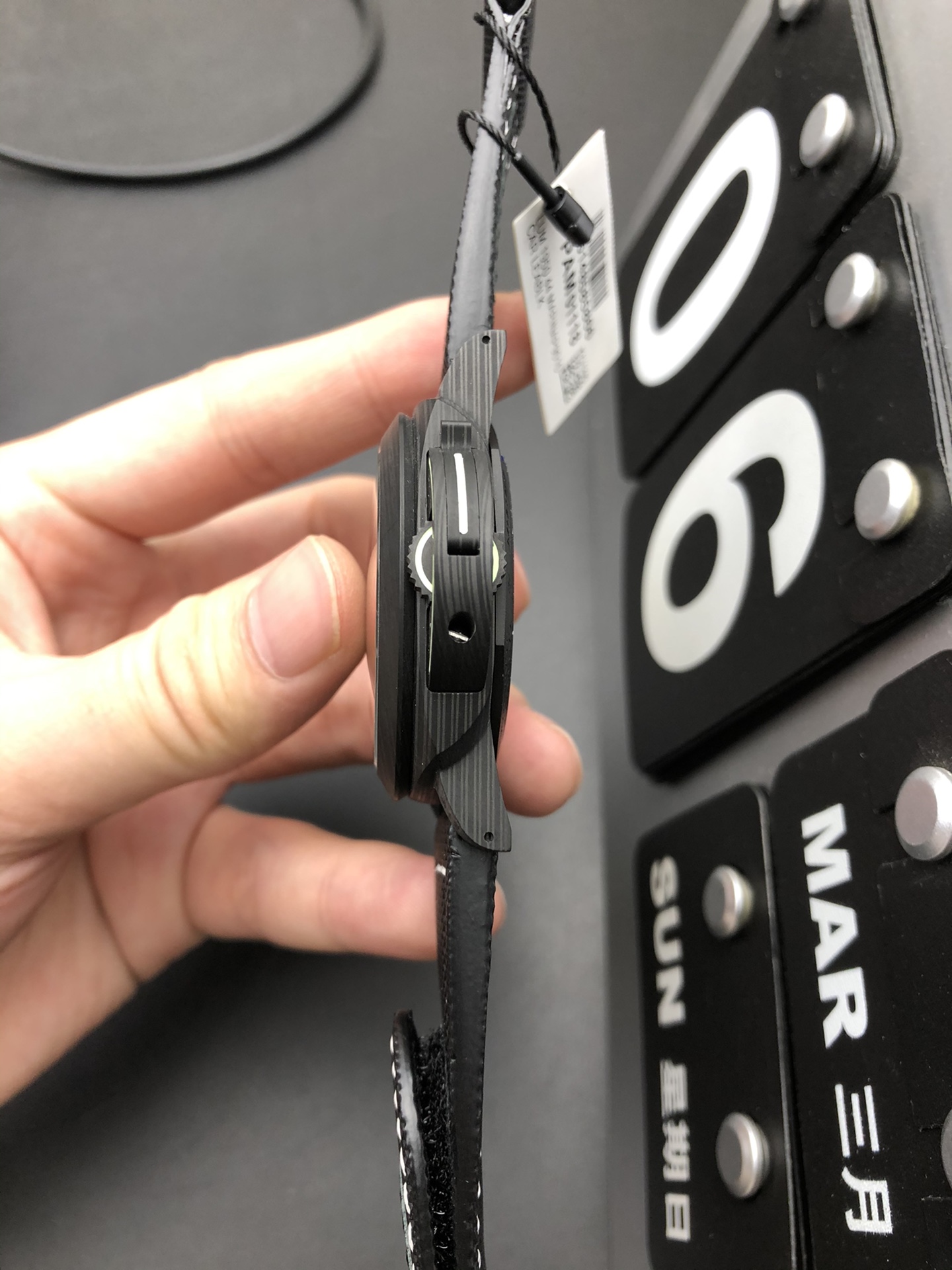 High-Performance Sportech Strap: Elevating this piece to the highest level of modern sports utility, it is mounted on Panerai’s innovative “Sportech” strap. This material features a rubberized, woven fabric texture that is highly water-resistant and durable, accented by crisp white contrast stitching that ties the whole modern aesthetic together.