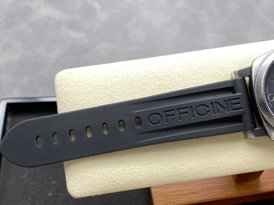 Strap: Premium Black Caoutchouc (Rubber) Diver Strap with Embossed “PANERAI” and “OFFICINE” Block Lettering, paired with a distressed Brunito Steel Pre-V Tang Buckle
