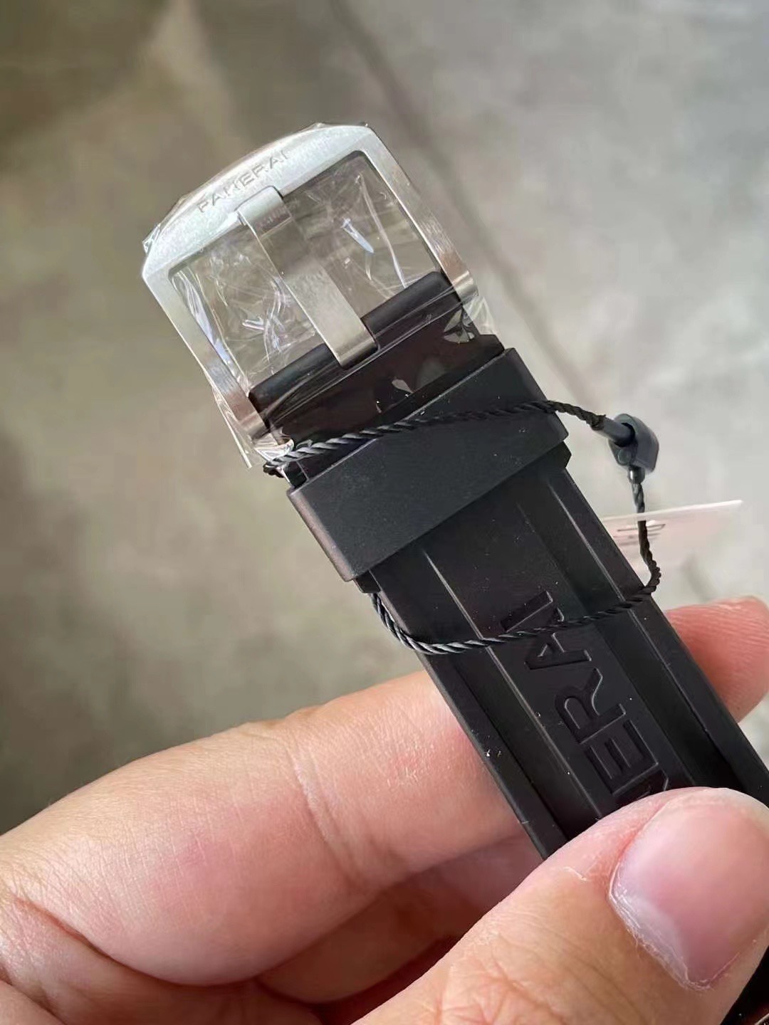 • Strap: Premium Black Caoutchouc (Rubber) Diver Strap with Embossed “PANERAI” Block Lettering and Polished Steel Pre-V Tang Buckle