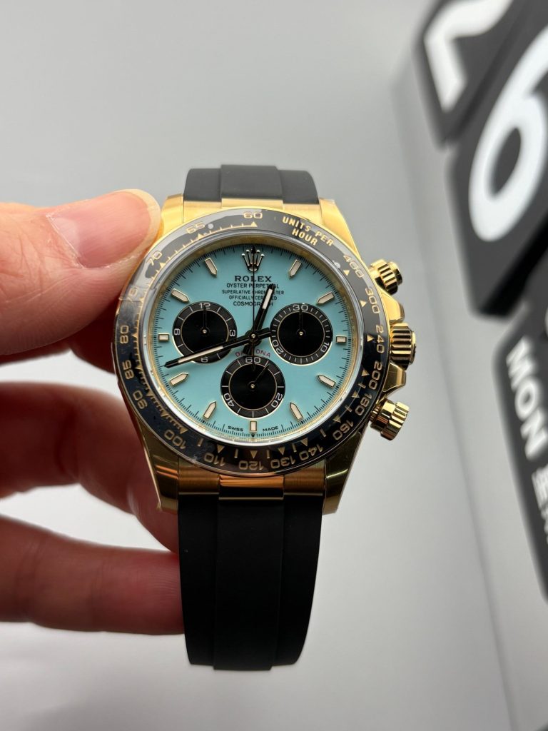 Premium Oysterflex Rubber Strap: The absolute standout feature for daily wear is its highly accurate 1:1 Oysterflex strap. This high-performance black elastomer (rubber) strap features a flexible titanium and nickel alloy core blade hidden inside. It provides the heavy-duty durability of a metal bracelet with the supreme comfort, lightweight feel, and sporty look of a premium rubber strap.
