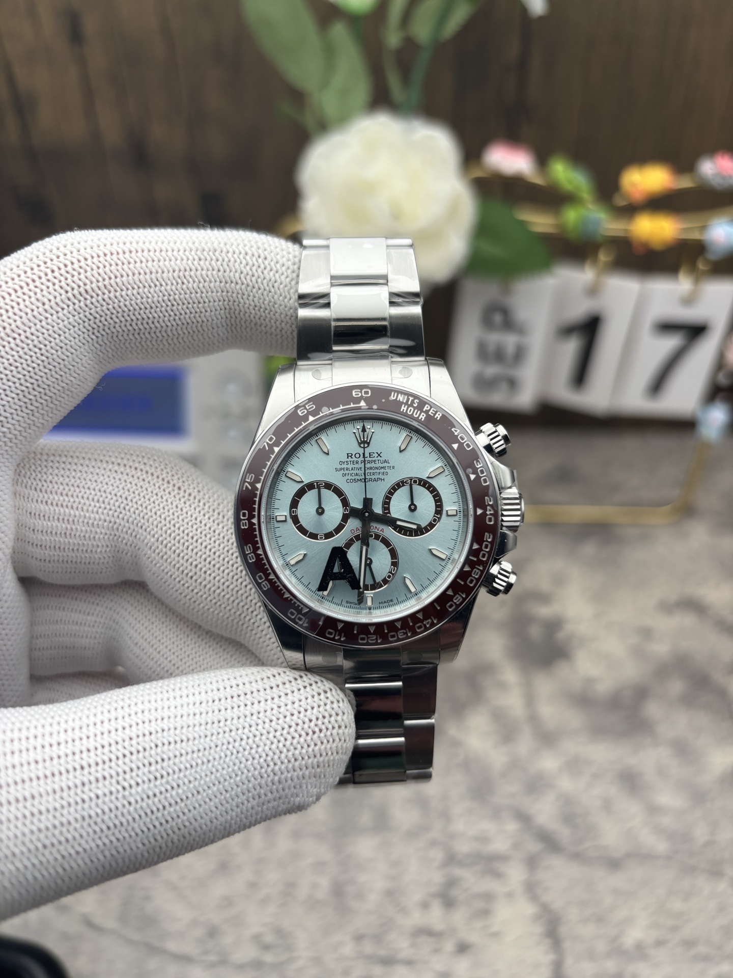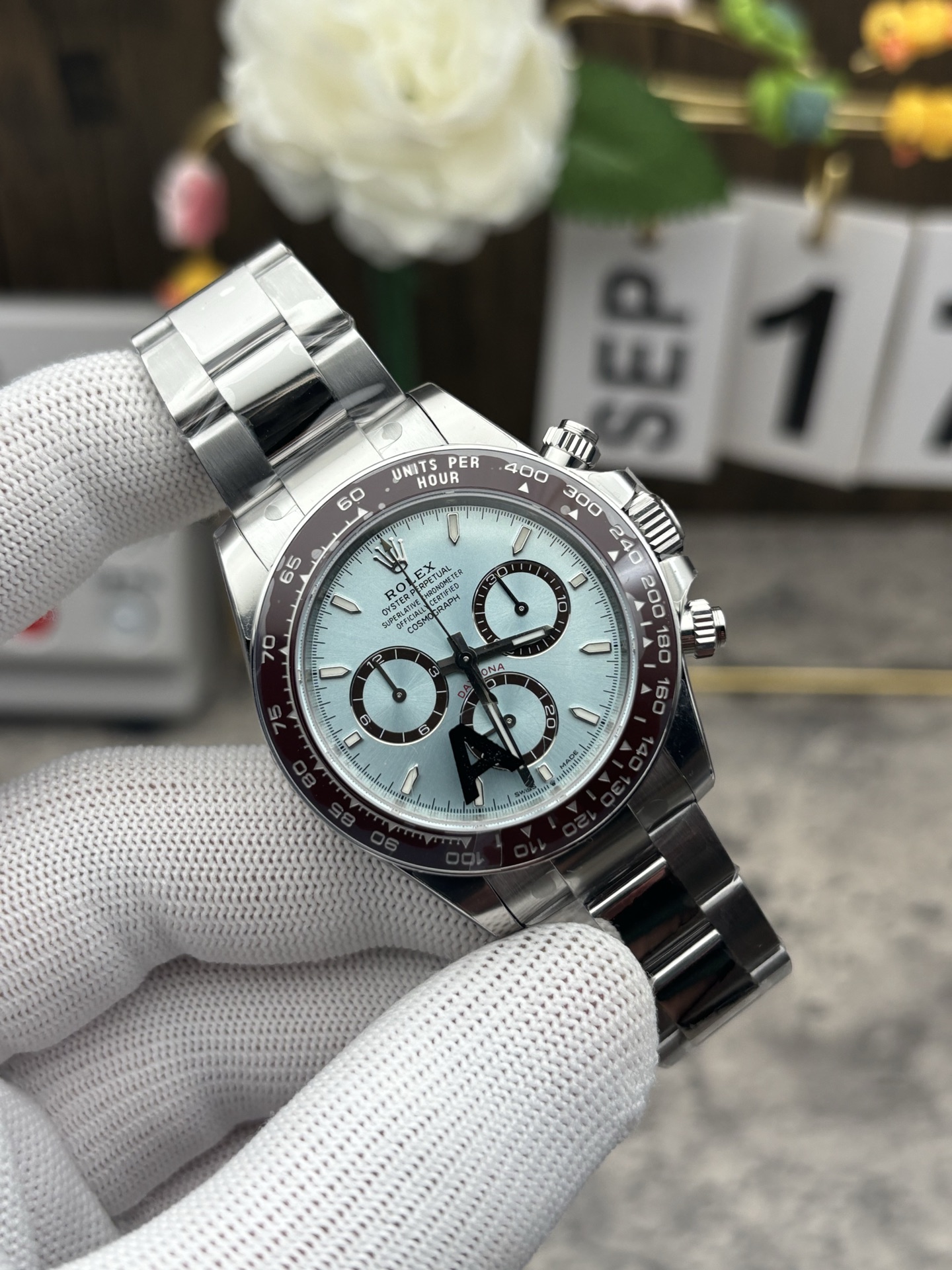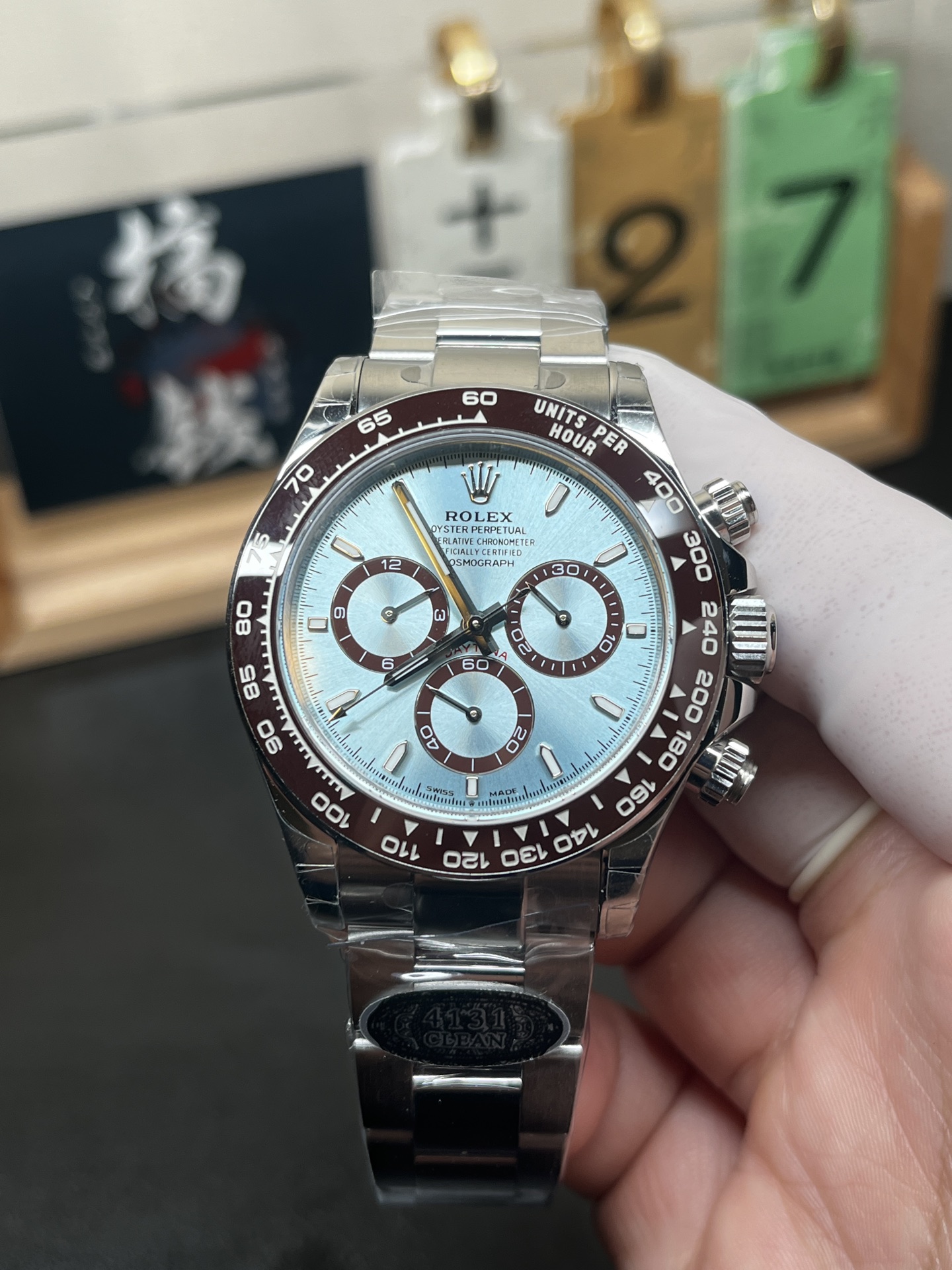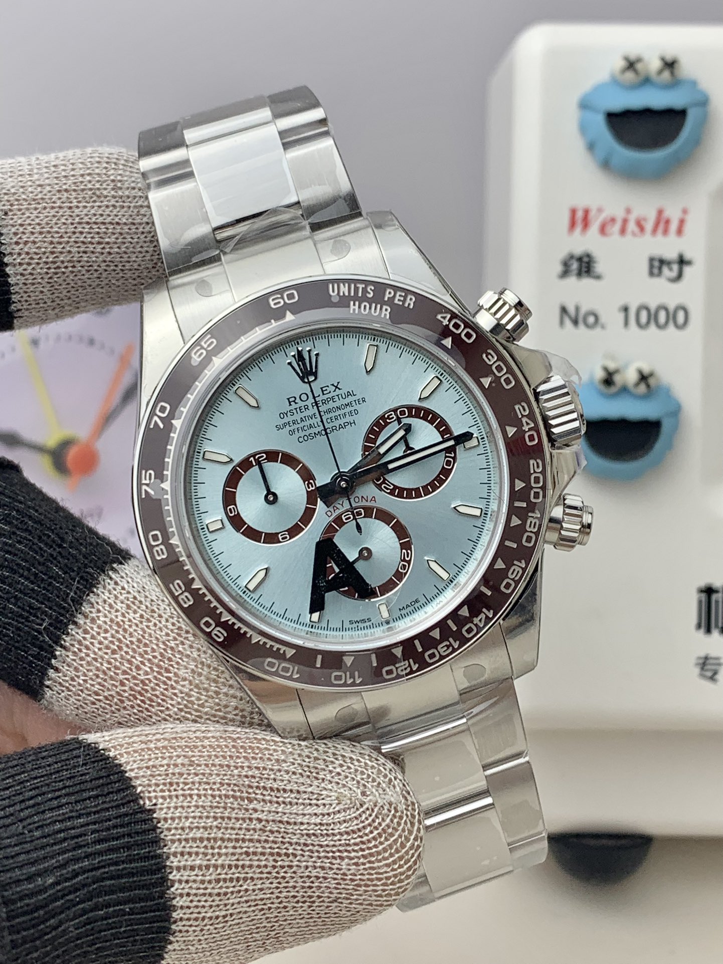 • Iconic Ice Blue Dial: In the Rolex catalog, the ice blue dial is exclusively reserved for platinum models. VS Factory has masterfully replicated this mesmerizing sunburst finish, which dynamically shifts in color depending on the lighting. It is perfectly contrasted by the glossy chestnut brown rings on the chronograph subdials—which now feature the refined, slightly narrower proportions characteristic of the new 4131 generation.