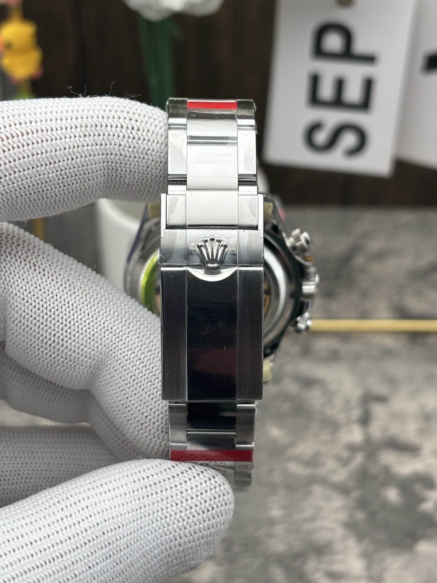 • Simulated Platinum Luster: While the genuine is made of solid 950 platinum, this 1:1 super clone utilizes top-tier 904L stainless steel. VS Factory applies a specialized, flawless high-polish finish to the case and the center links of the solid Oyster bracelet, perfectly replicating the distinct, bright white gleam and heavy-hitting presence of genuine platinum.