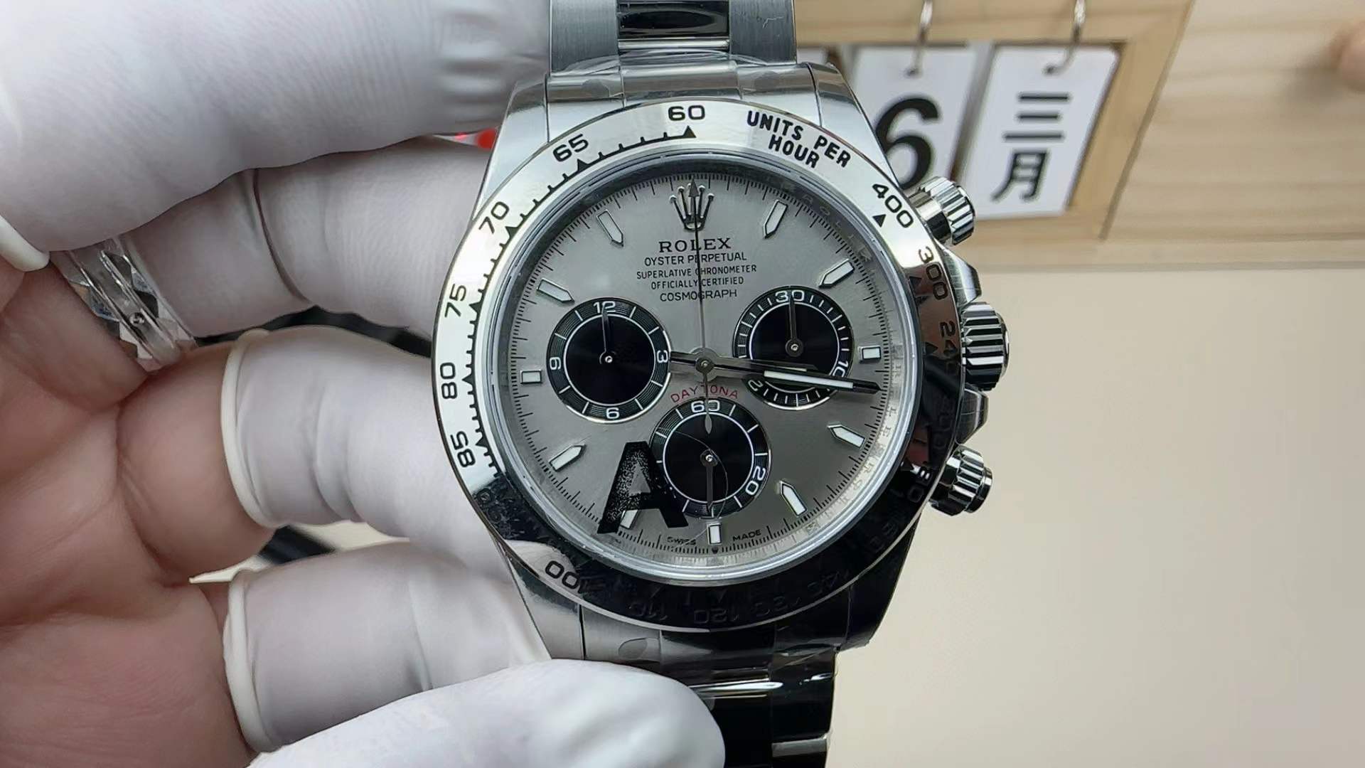The Silver/Black “Racing” Aesthetic: The dial is a masterclass in high-contrast tactical design. The heavy sunray finish allows the silver base to shift dynamically in the light, providing the perfect metallic backdrop for the pitch-black sub-dials. This specific “panda-esque” configuration offers maximum high-speed legibility, perfectly accented by the aggressive pop of the red Daytona text.