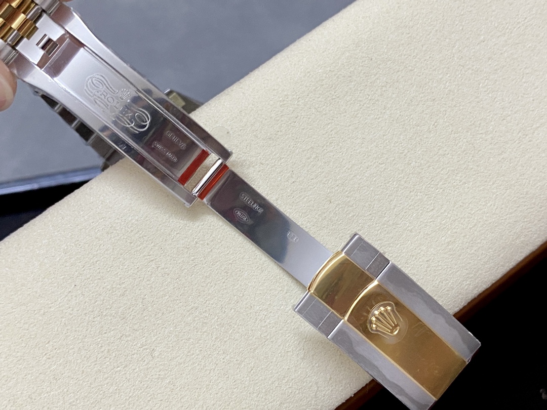 • The “Yellow Rolesor” Aesthetic: This configuration offers the classic, high-contrast luxury look that defined Rolex for decades. The outer links of the Jubilee bracelet and the main case are forged from durable, highly polished 904L Oystersteel, while the bezel, crown, and center links are heavily plated in rich 18K yellow gold. VSF has masterfully perfected this warm gold hue to perfectly match genuine Rolex gold, avoiding any overly brassy or fake-looking tones.