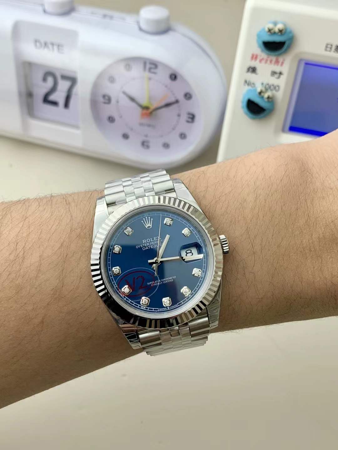The “Blue Diamond” Canvas: This is the absolute core of this asset’s visual dominance. The blue sunburst dial is arguably Rolex’s most requested Datejust color, shifting from a bright, electric oceanic blue to a deep navy depending on the lighting environment. By replacing the standard luminous batons with brilliant-cut simulated diamonds, VSF has transformed this tactical operator into a high-society statement piece.