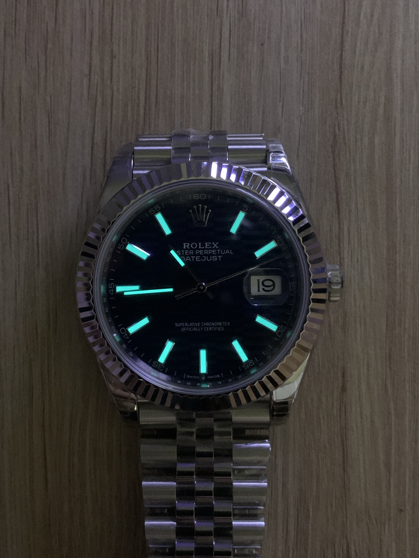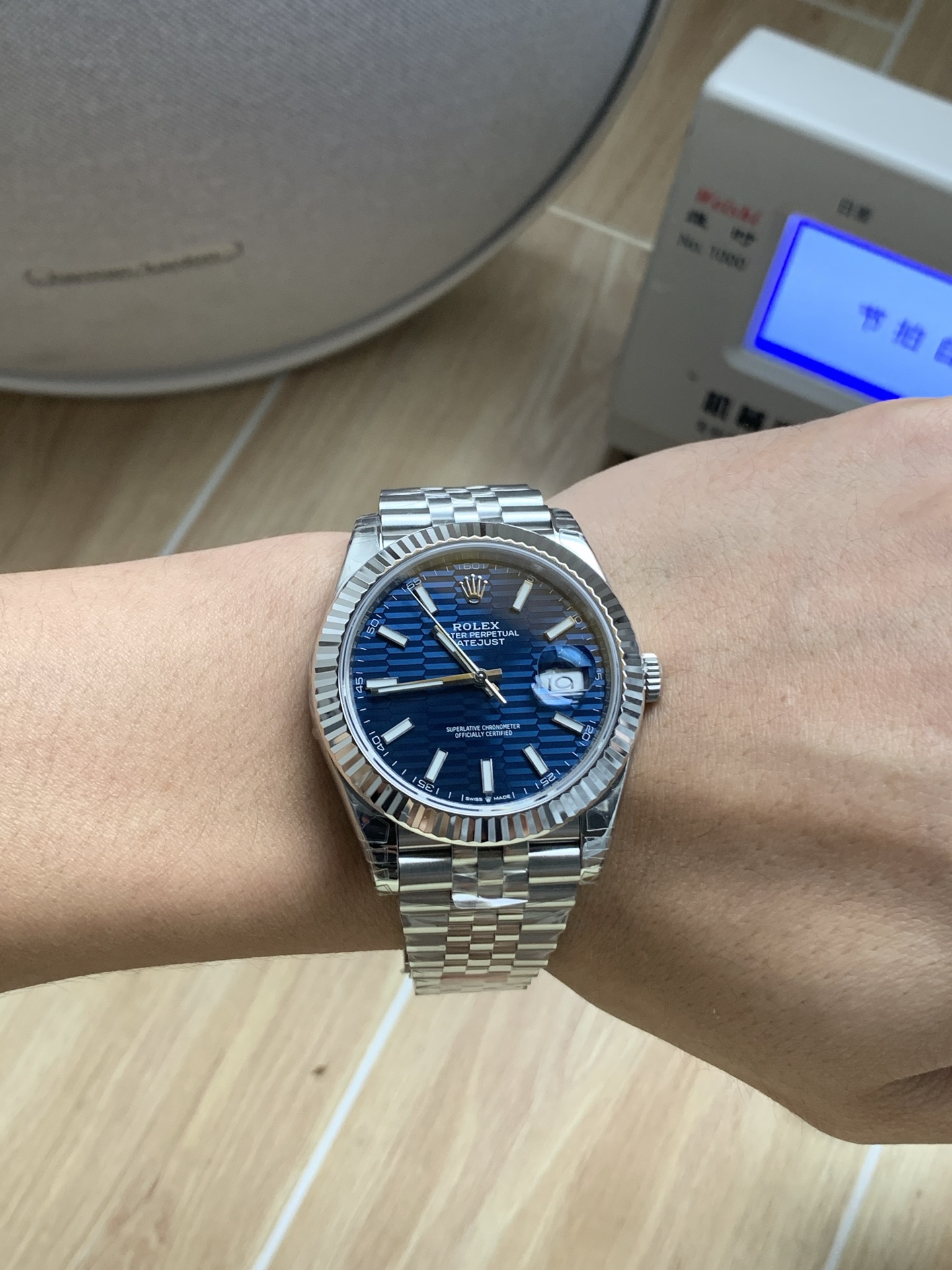 Signature Fluted Bezel: The deeply faceted fluted bezel acts like a prism, catching and scattering light with every movement of the wrist. On the larger 41mm case, this bezel has a significantly larger surface area, resulting in a brilliant, wealthy sparkle that perfectly mimics genuine 18K white gold and harmonizes seamlessly with the textured dial.