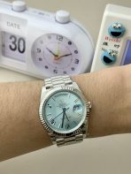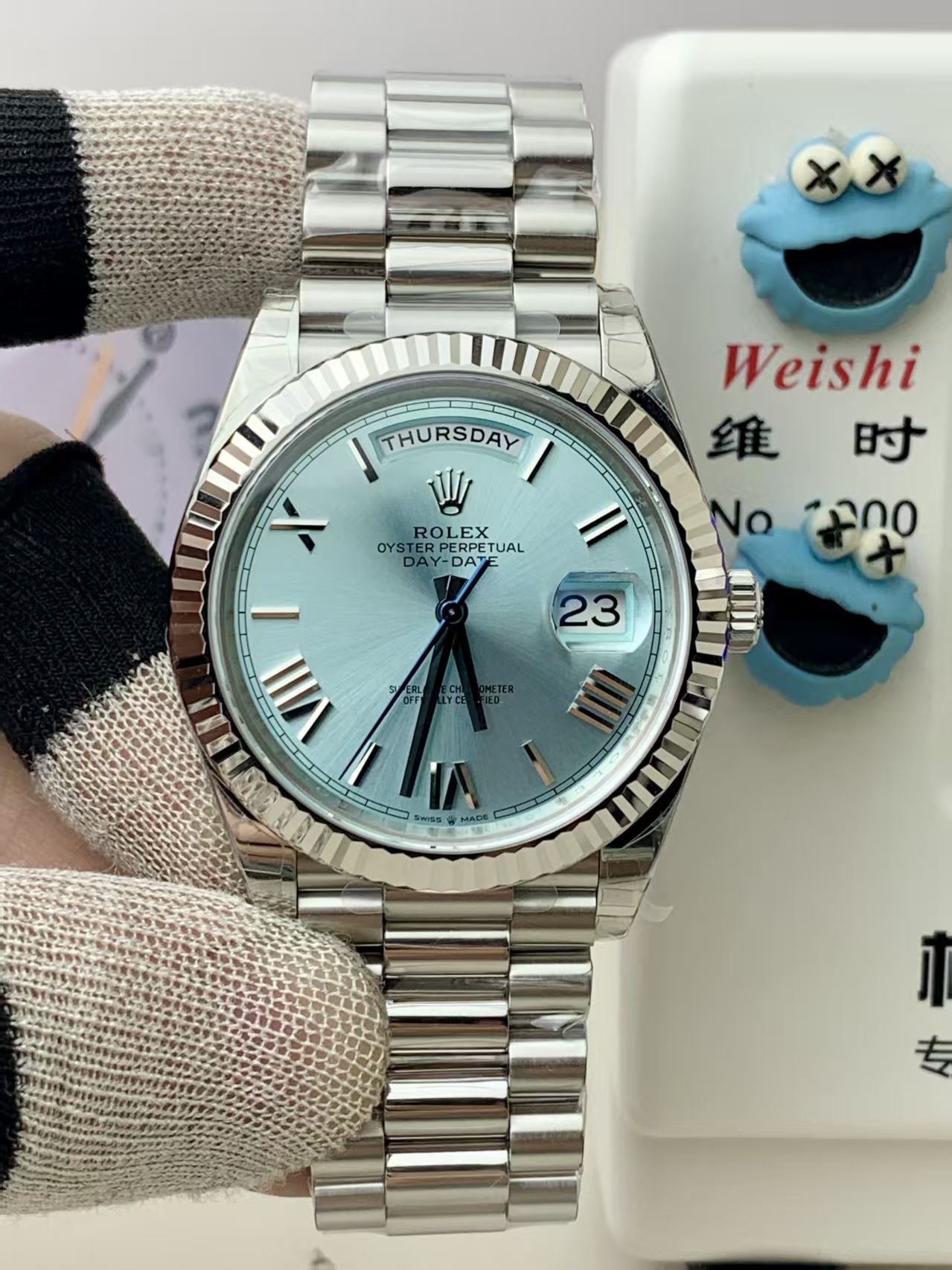The Rolex Day-Date 40 (Reference 228236) represents the absolute zenith of luxury watchmaking. Historically, the Day-Date was only available in gold, but the introduction of Platinum—paired exclusively with the mesmerizing Ice Blue dial—created the ultimate “if you know, you know” status symbol. Flawlessly executed by the master watchmakers at VS Factory (VSF), this 1:1 replica captures the breathtaking elegance and icy exclusivity of the genuine article. Housed in the classic 40mm Oyster case, this specific model features the iconic fluted bezel (a feature Rolex recently made available for platinum models, replacing the traditional smooth bezel). The absolute standout feature is the spectacular sunray Ice Blue dial, punctuated by sharp, deconstructed Roman numeral hour markers. Mounted on the legendary semi-circular three-piece link President bracelet, this piece commands absolute authority. Powered by the incredibly advanced Dandong 3255 1:1 automatic clone movement, it delivers unparalleled reliability and the signature instantaneous midnight jump for both the day and date wheels.