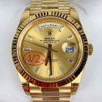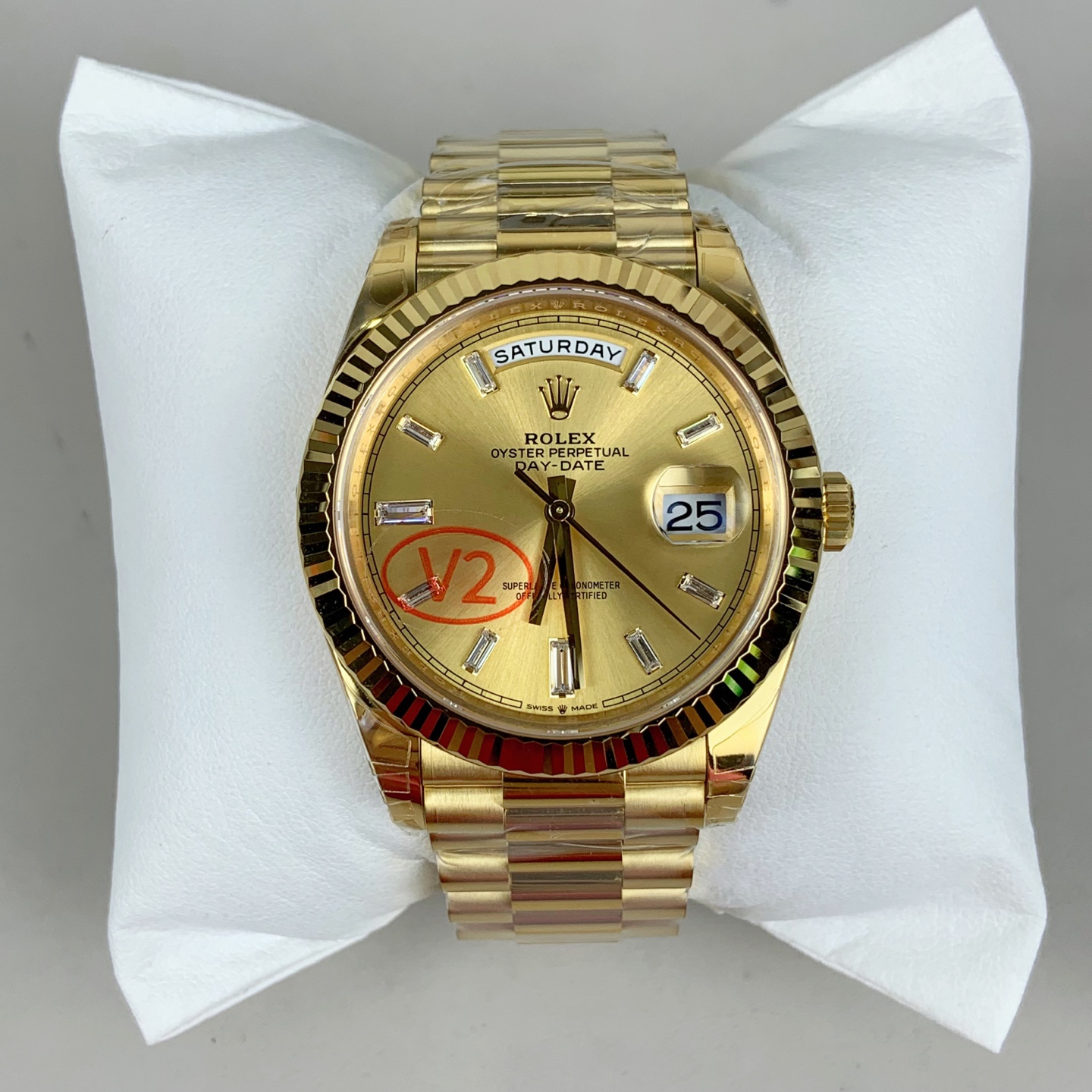 The Rolex Day-Date 40 (Reference 228238) is the ultimate, universally recognized symbol of success, and this specific “gold-on-gold” configuration is the absolute quintessential classic. Flawlessly executed by the master watchmakers at VS Factory (VSF), this highly anticipated V2 Upgraded Edition captures the breathtaking opulence and massive wrist presence of the genuine article. Housed in the classic 40mm Oyster case, it features the signature fluted bezel heavily plated in rich 18K Yellow Gold. The absolute standout feature is the spectacular Champagne sunray dial, providing a seamless, wealthy monochromatic look that is violently punctuated by custom-cut baguette diamond hour markers. Mounted on the legendary semi-circular three-piece link President bracelet, this piece is the ultimate traditional high-status flex. Powered by the incredibly advanced Dandong 3255 1:1 automatic clone movement, it delivers unparalleled reliability and the signature instantaneous midnight jump for both the day and date wheels.