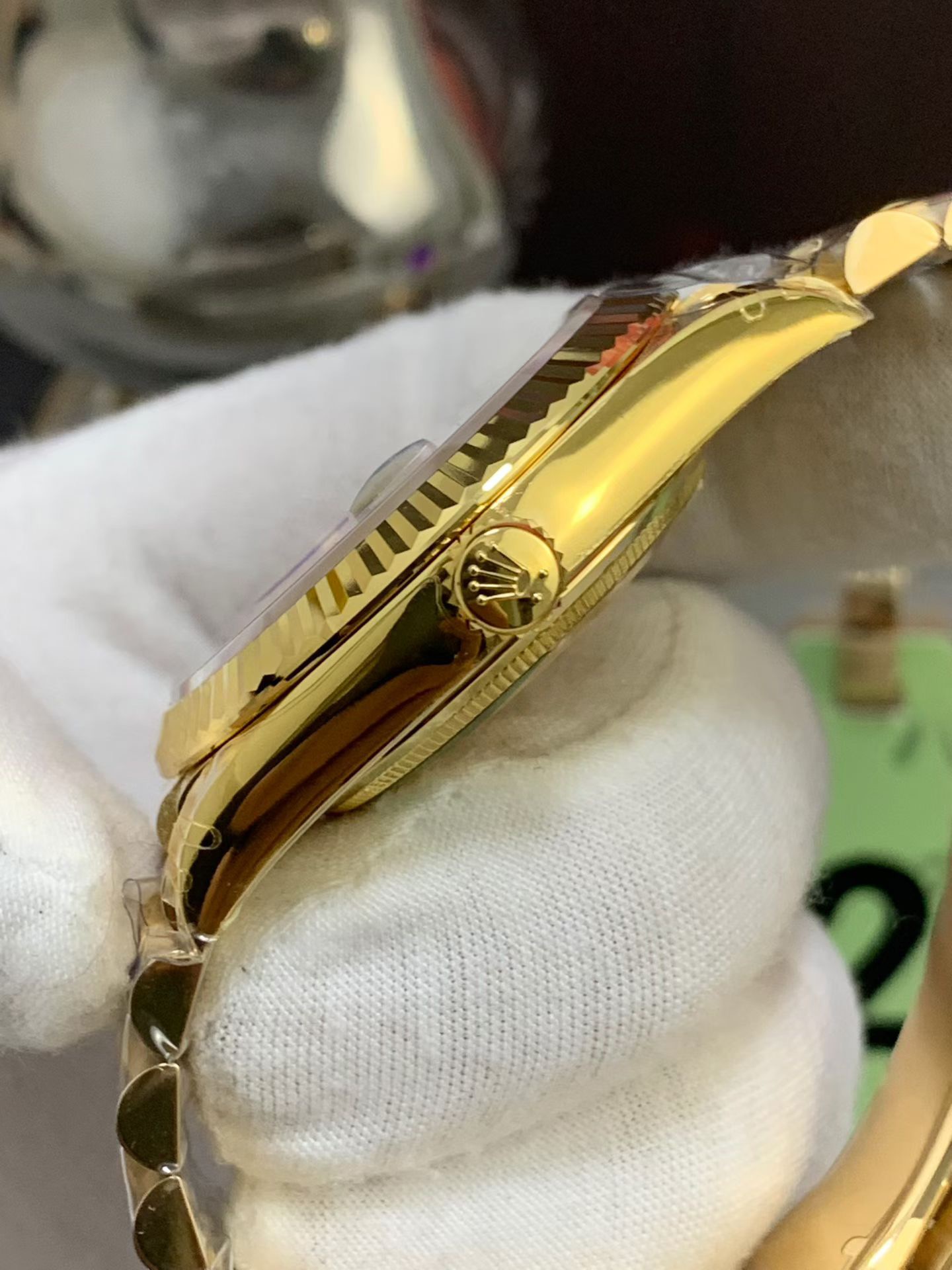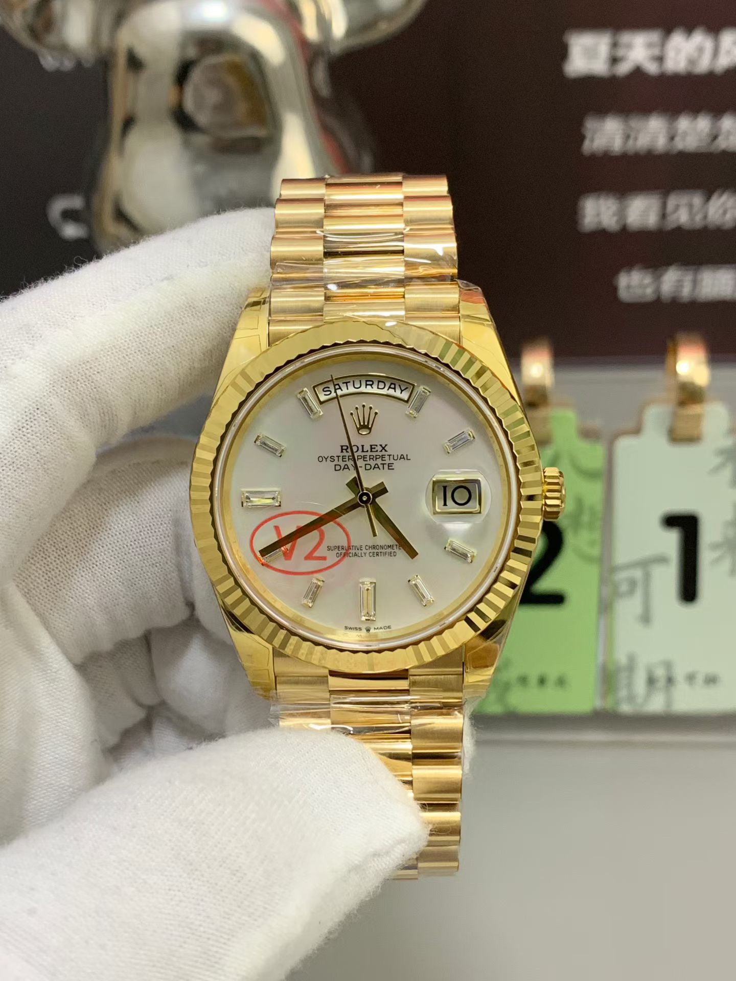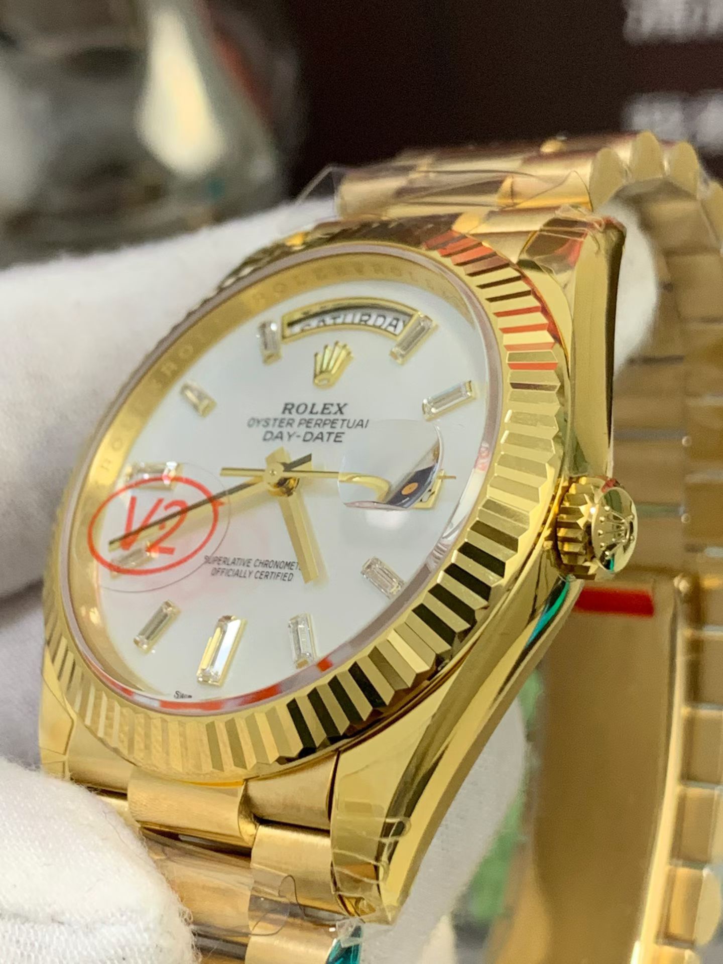 The V2 Gold & Font Upgrade: The prominent “V2” batch signifies massive improvements over previous iterations. VSF has perfected the electroplating formula, ensuring the 18K Yellow Gold tone perfectly matches the proprietary, warm hue of genuine Rolex gold without looking too brassy or yellow. Additionally, the day and date wheel fonts have been refined for perfect thickness and centering.