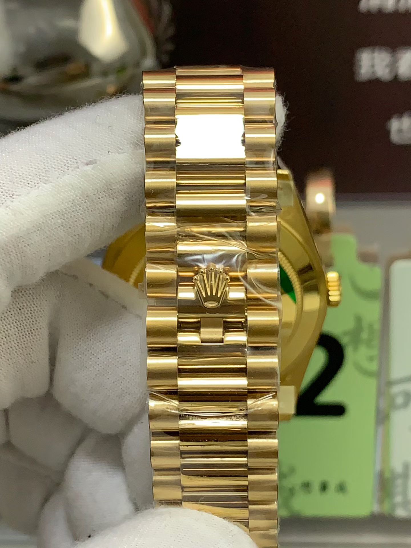 The Iconic President Bracelet: A Day-Date is defined by its bracelet. VSF has flawlessly engineered the exclusive President bracelet, featuring the signature semi-circular three-piece links. The outer links are brushed while the center links are mirror-polished, creating a mesmerizing play of light. It is secured by the elegant, seamless concealed folding Crownclasp.