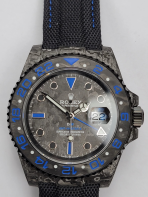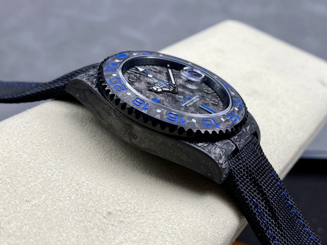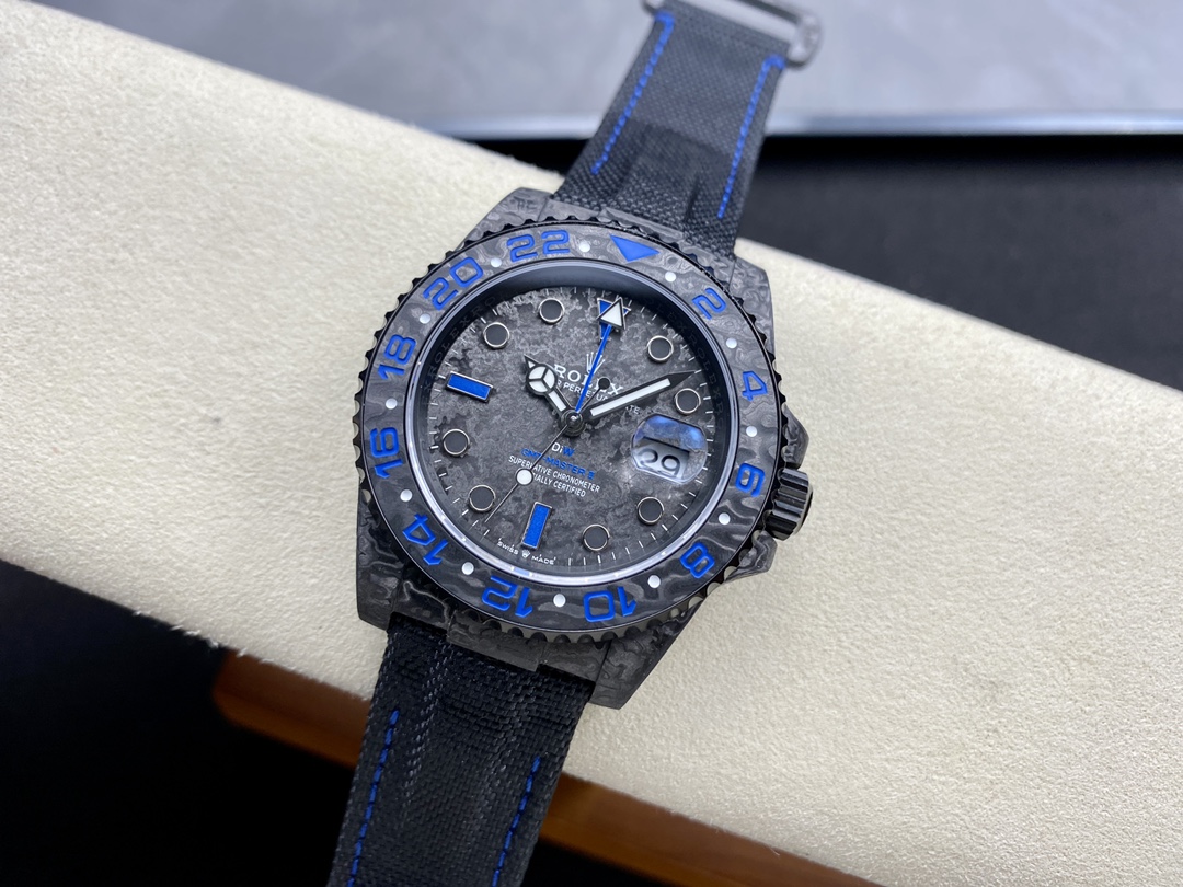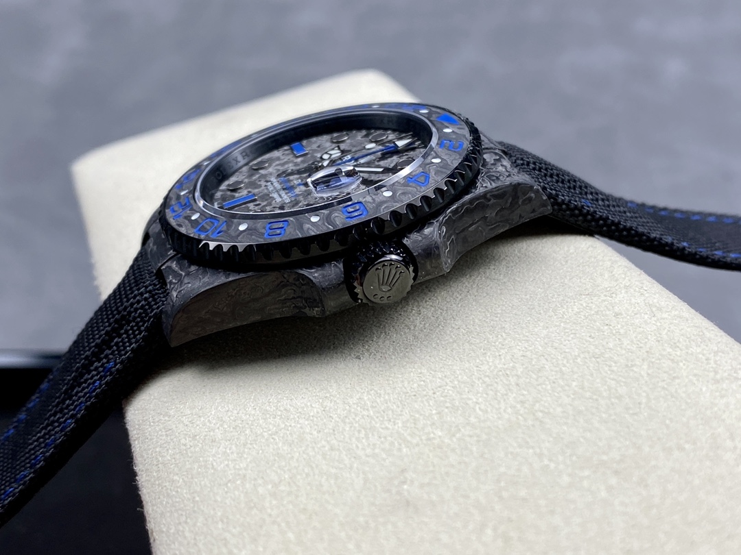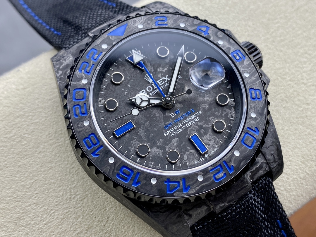 Exclusive DiW Custom Dial (Blue Theme): The custom dial features a matching forged carbon texture, highlighted by vibrant blue details. It includes the distinct blue “DiW” logo, blue “GMT-MASTER II” text, and a custom blue GMT hand that provides a stunning contrast against the dark carbon background.