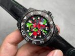 Custom Bezel & Strap Integration: The forged carbon bezel is engraved with a custom 24-hour scale, featuring white numerals separated by bright red dot markers that echo the red splashes on the dial. The premium black canvas strap is finished with vibrant green stitching, perfectly tying the entire colorway together.