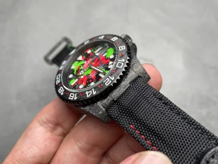 The VS Factory GMT-Master II “DiW Carbon Splatter” is a breathtaking and highly expressive 1:1 super clone of the exclusive custom timepieces by Designa Individual Watches (DiW). Breaking away from traditional aesthetics, this masterpiece combines an ultra-lightweight, stealthy forged carbon fiber case with a vibrant, avant-garde “paint splatter” artistic dial. Powered by VSF’s flagship Dandong 3285 (DD3285) movement, this model perfectly balances modern street-art aesthetics, advanced material science, and uncompromising mechanical stability.