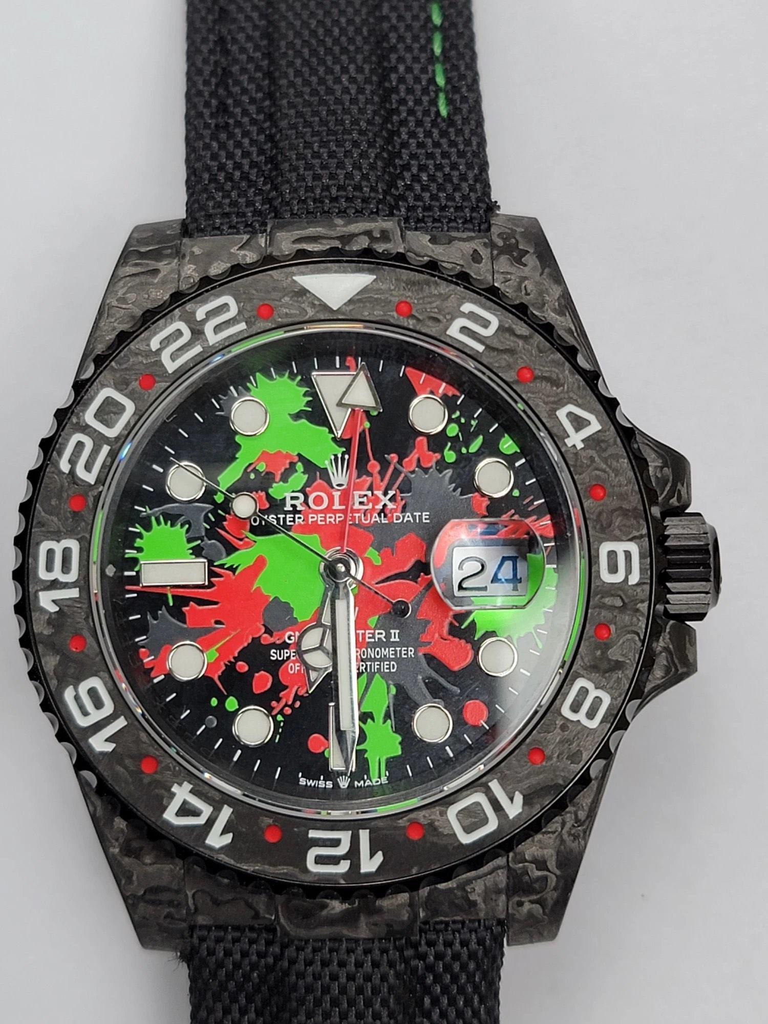 Exclusive “Splatter Art” Dial: The absolute standout feature of this model is its striking dial. It features an aggressive “paint splash” or graffiti-style design with vibrant bursts of neon green and bright red over a dark background. To complete the look, it utilizes classic white hour markers and a striking red GMT hand, making it a true piece of wearable modern art.