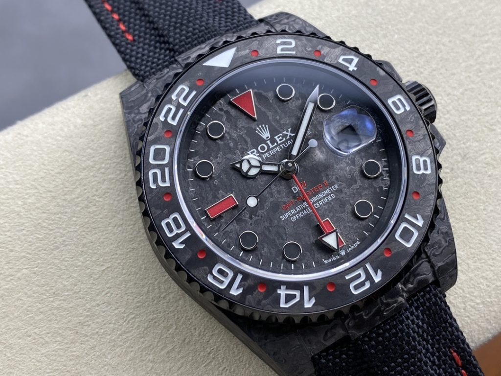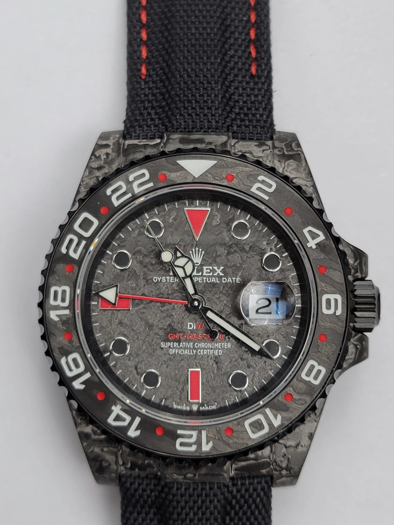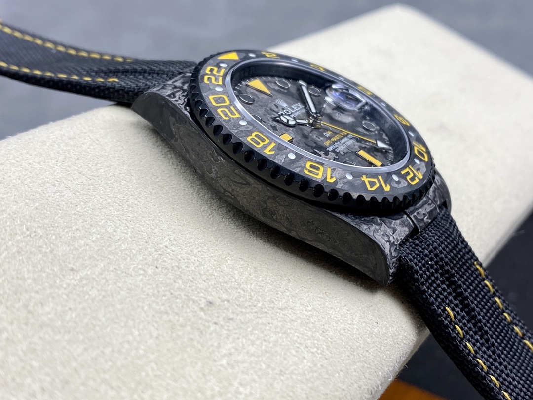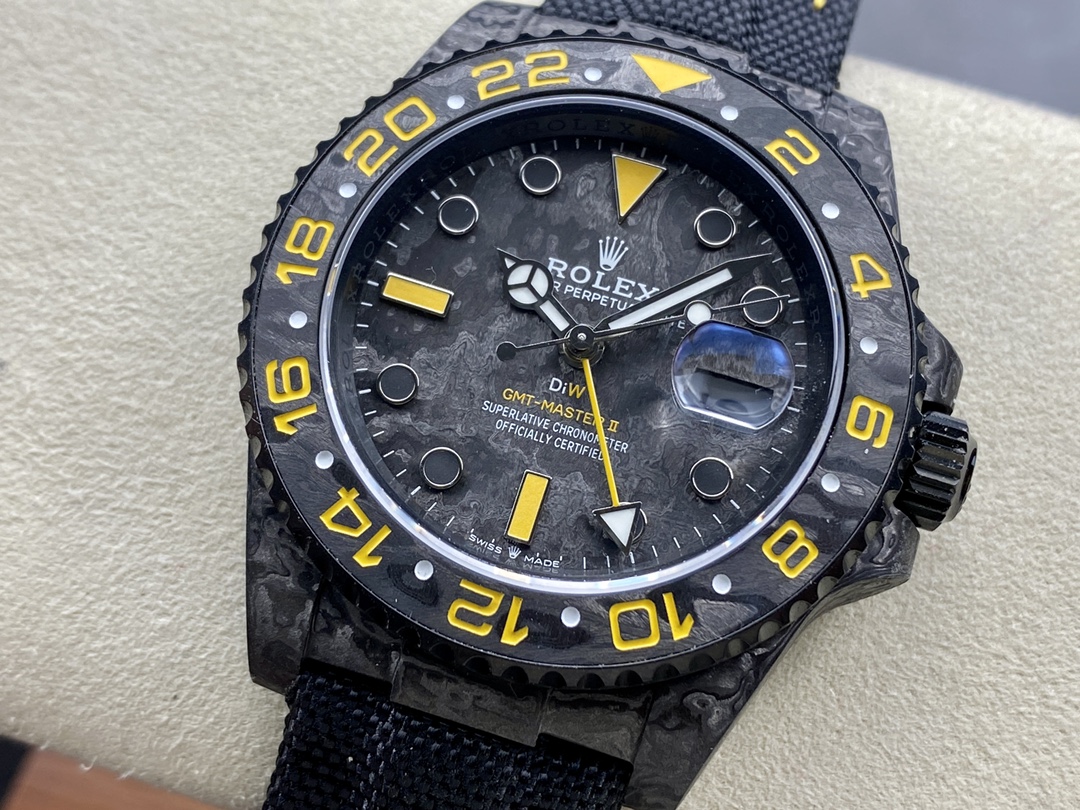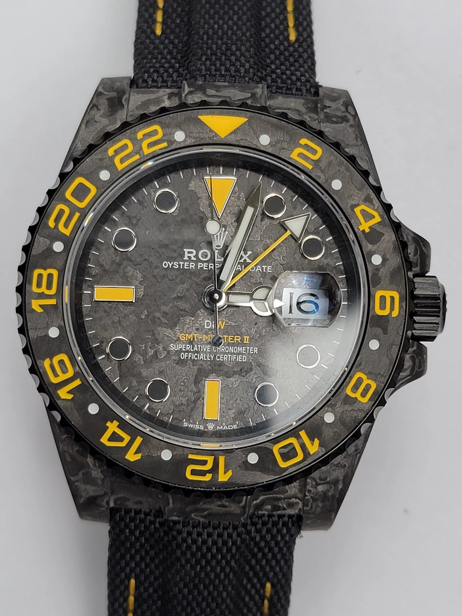 • Exclusive DiW Custom Dial (Yellow Theme): The custom dial features a matching forged carbon texture, highlighted by bold yellow details. It includes the distinct yellow “DiW” logo, yellow “GMT-MASTER II” text, yellow hour marker surrounds, and a custom yellow GMT hand that provides a stunning, high-visibility contrast against the dark carbon background.