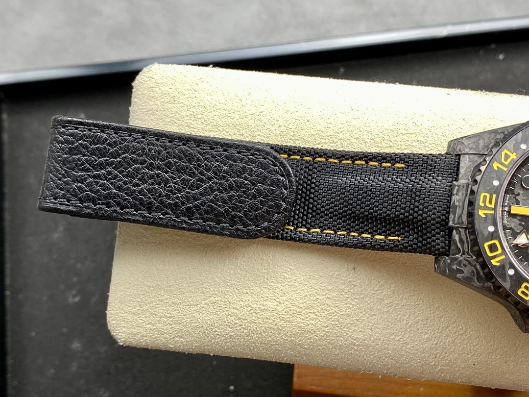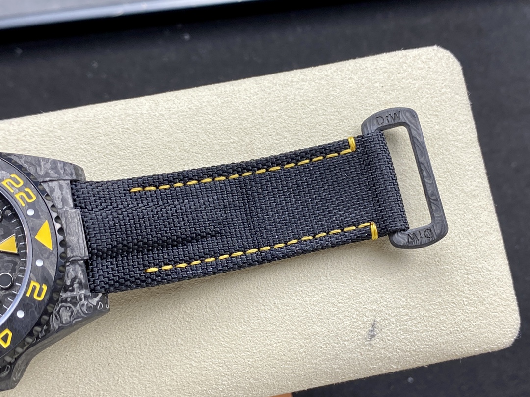 • Custom Bezel Details: The forged carbon bezel is meticulously engraved with a custom 24-hour scale, featuring unique bright yellow numerals separated by crisp white dot markers, staying 1:1 true to the original DiW design language.