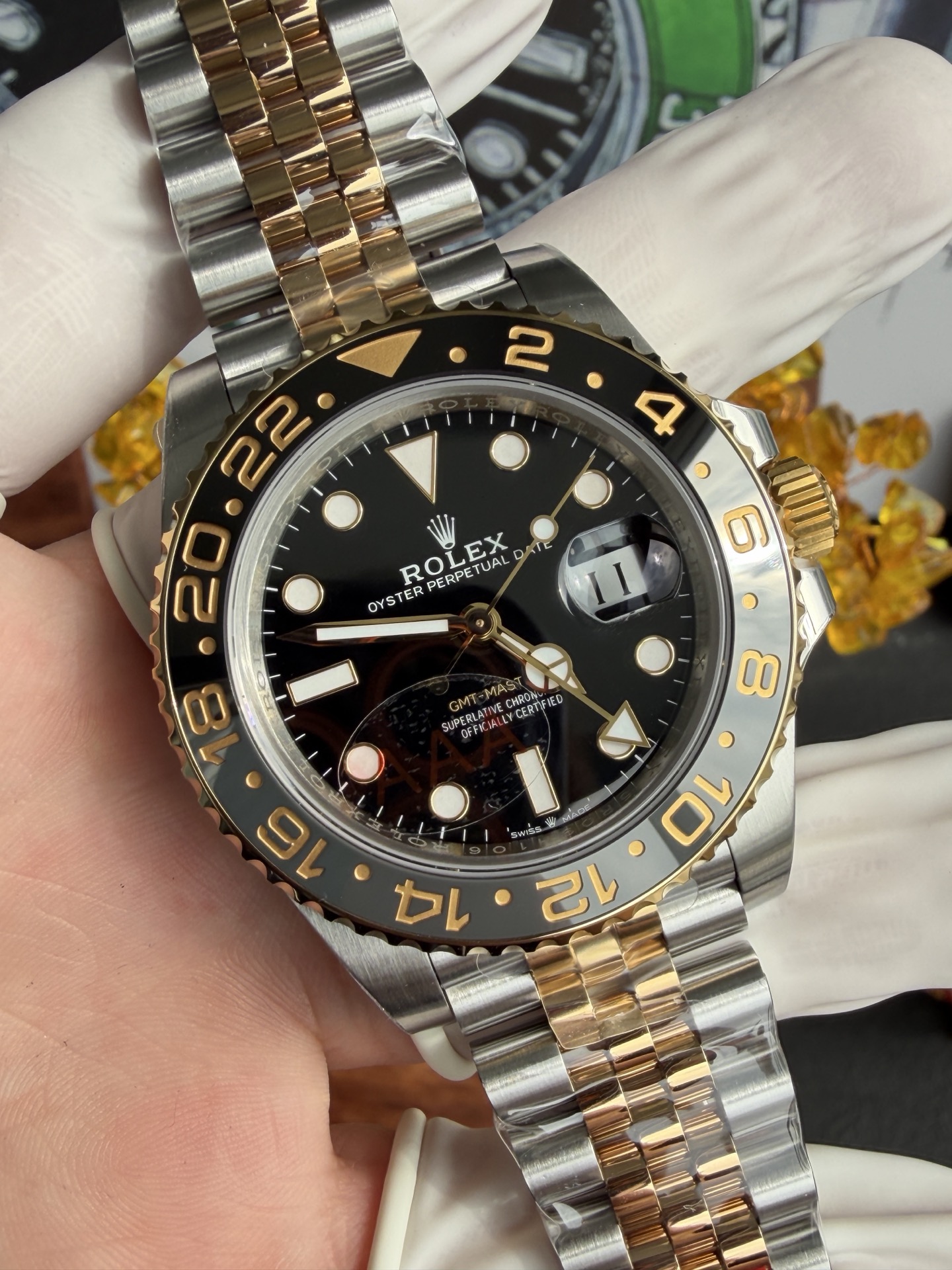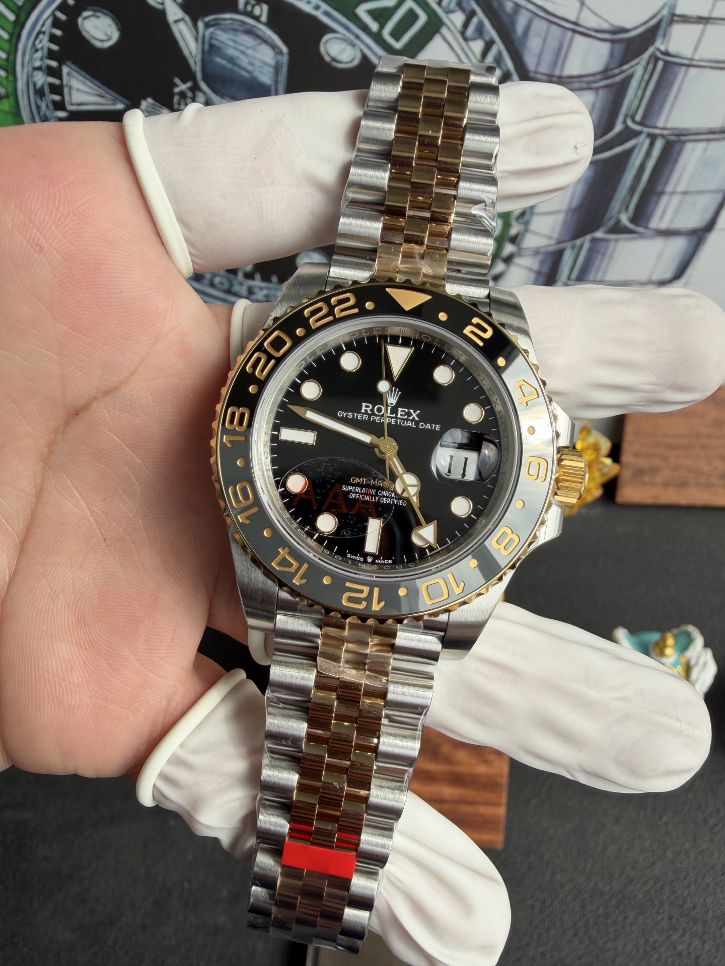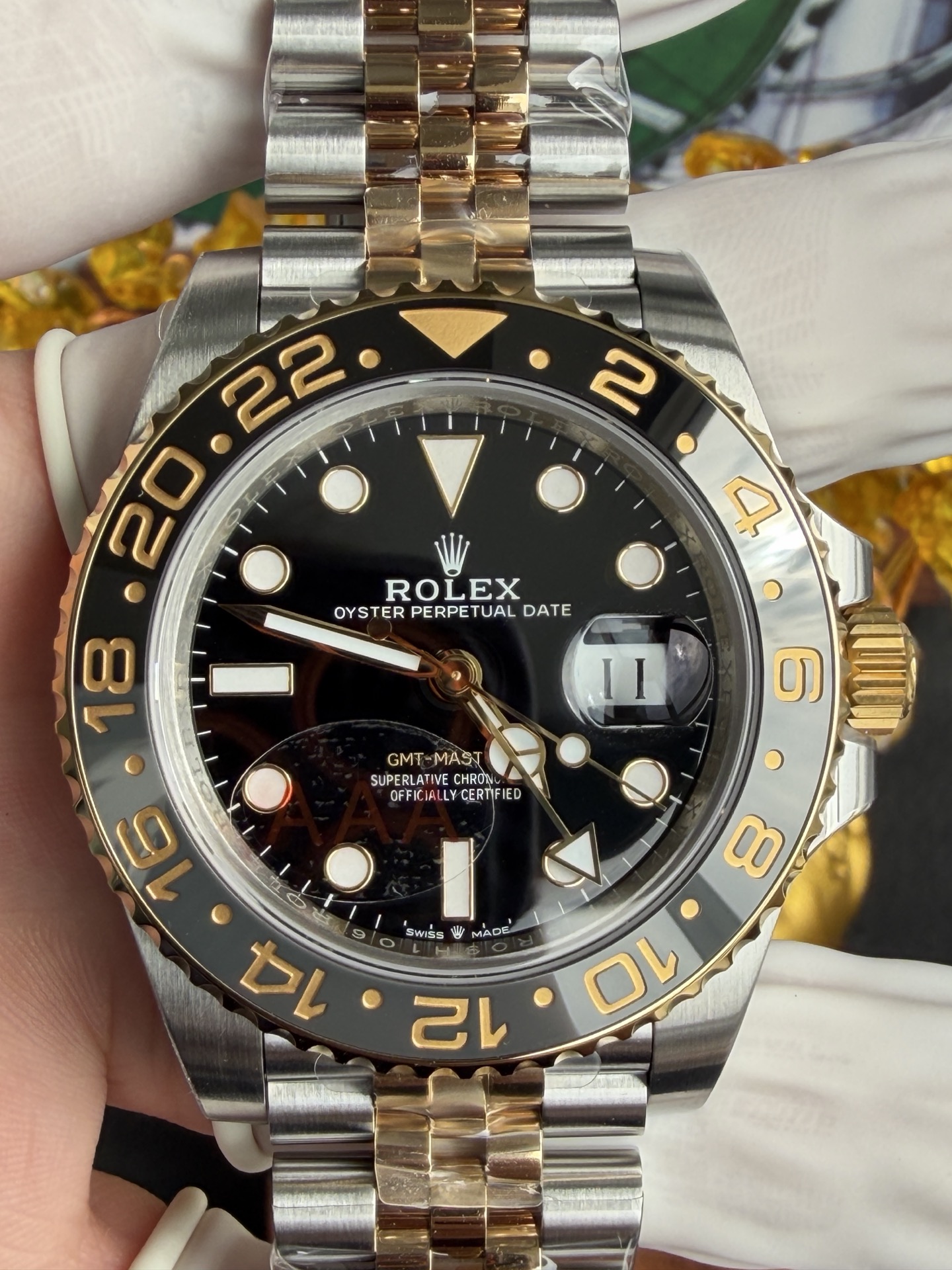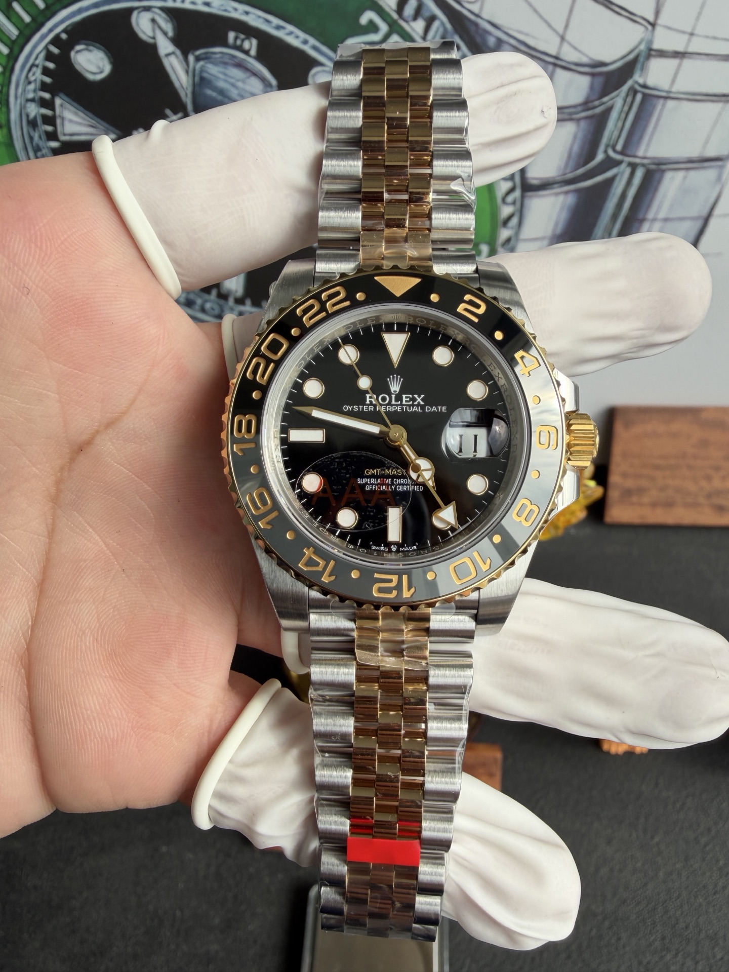 Premium Two-Tone Finish & Gold Accents: VSF has perfected the 18K yellow gold tone on the bezel edge, winding crown, and Jubilee bracelet center links, avoiding the “cheesy” or overly yellow hues found in lower-tier replicas. The dial features the correct yellow gold-toned GMT hand and “GMT-Master II” dial text, perfectly matching the genuine 126713GRNR configuration.