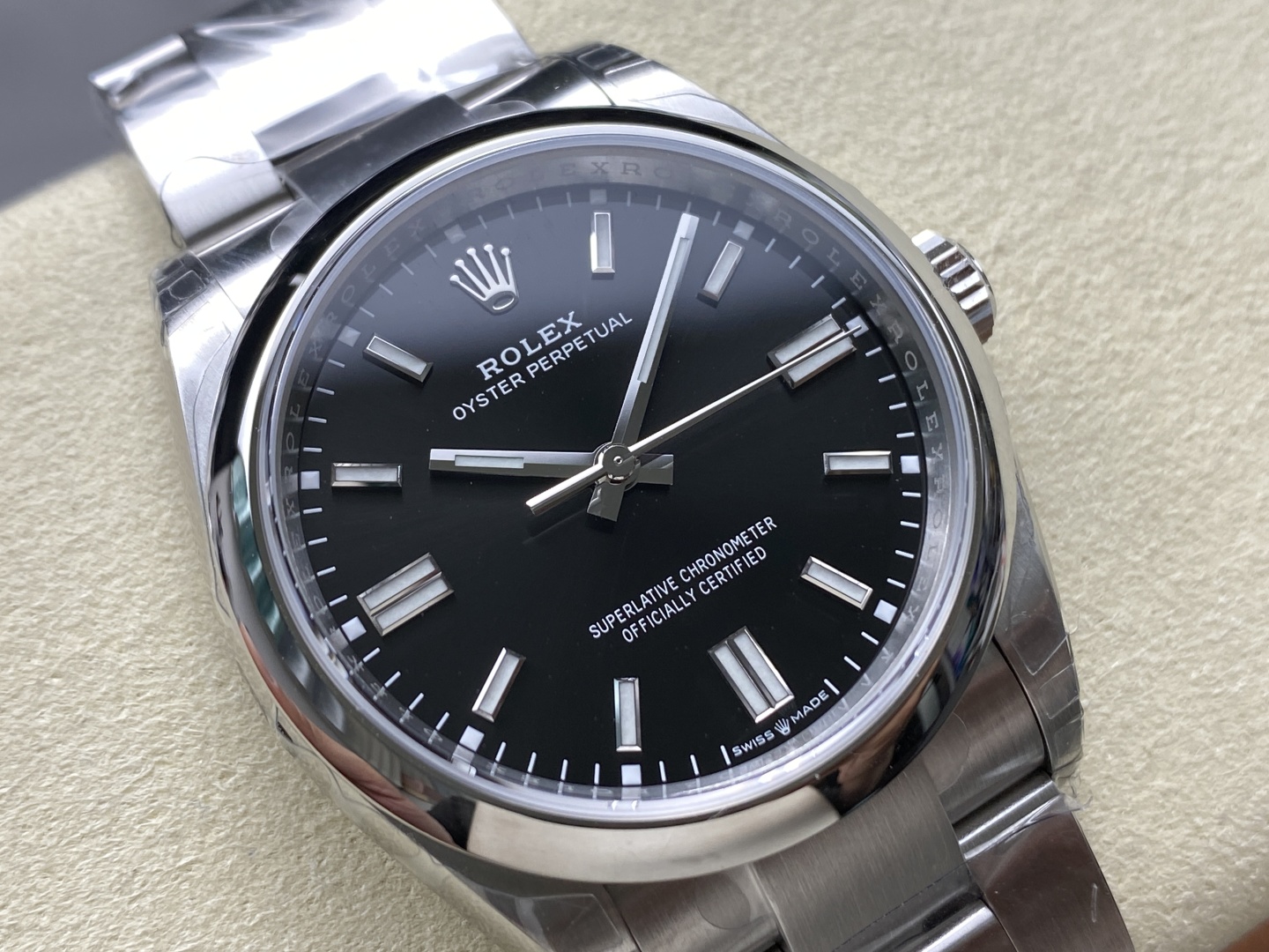 Rugged Fully Brushed Oyster Bracelet: Complementing the minimalist dial, the solid 904L steel Oyster bracelet is entirely satin-brushed. This tactical finish is incredibly effective at hiding daily wear-and-tear and grounds the elegant black dial with a sporty, utilitarian feel. It is equipped with the highly secure folding Oysterclasp and the convenient 5mm Easylink comfort extension system.