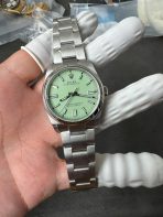 Streamlined Smooth Bezel: The fixed, smooth domed bezel is highly polished, adding a sharp, elegant frame to the pastel dial. It provides a clean, aerodynamic aesthetic that prevents snagging and allows the green face of the watch to command the visual focus.