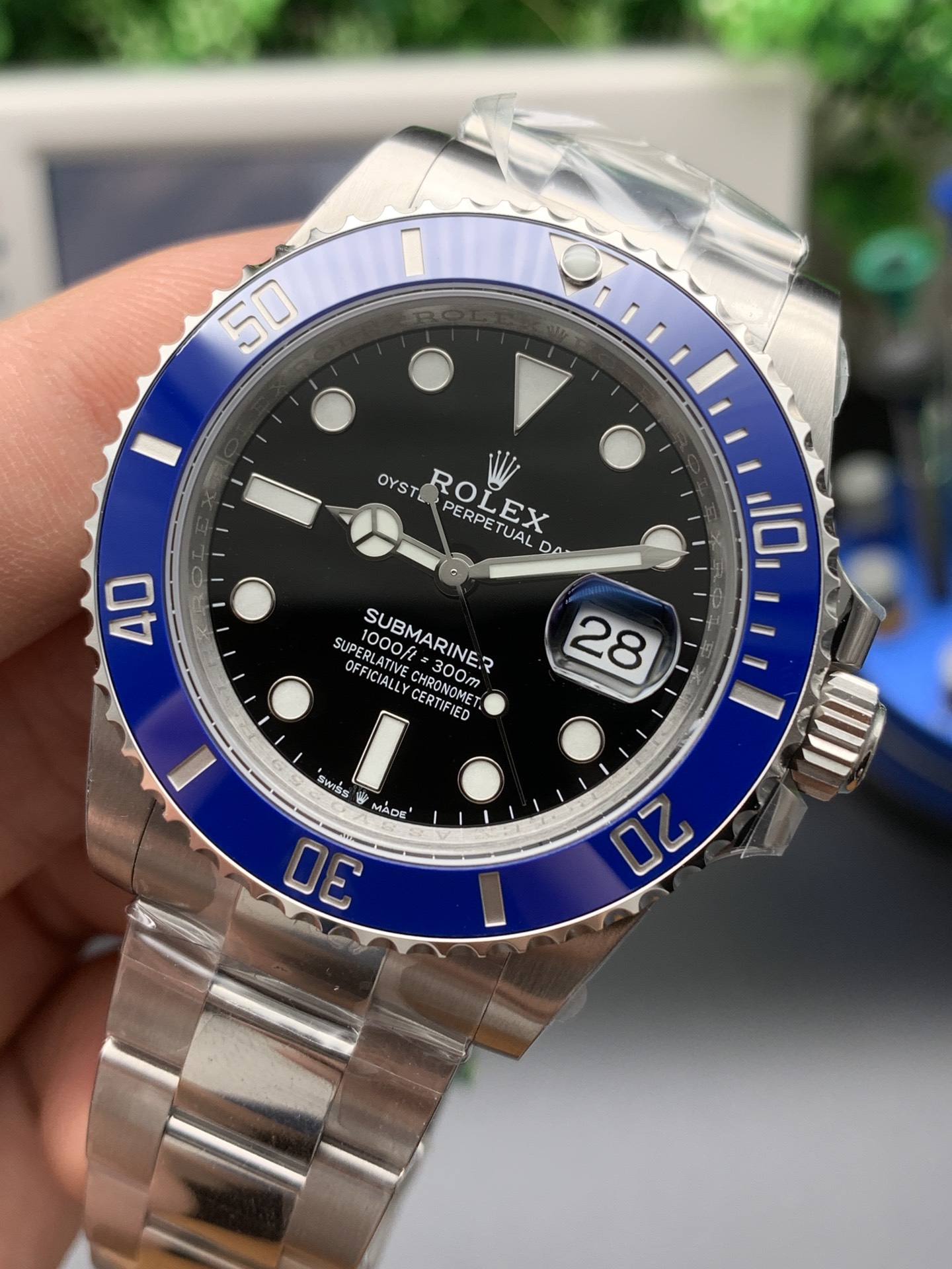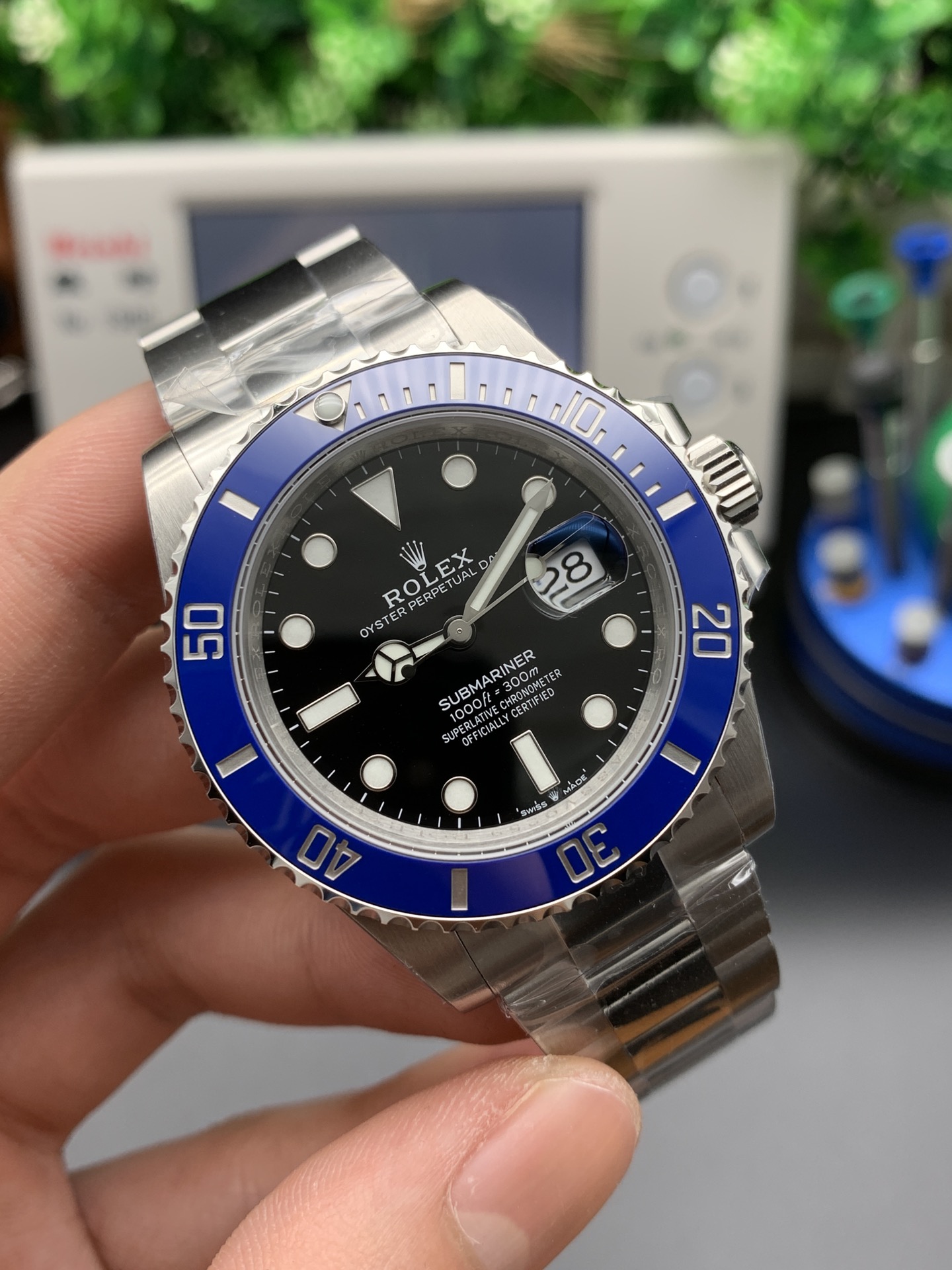 The “Cookie Monster” Aesthetic: VSF has perfectly captured the striking contrast between the vibrant blue ceramic bezel and the glossy black dial. Furthermore, the 904L steel is finished with a specific polishing technique designed to emulate the warmer, more luxurious tone of the genuine 18K white gold model.